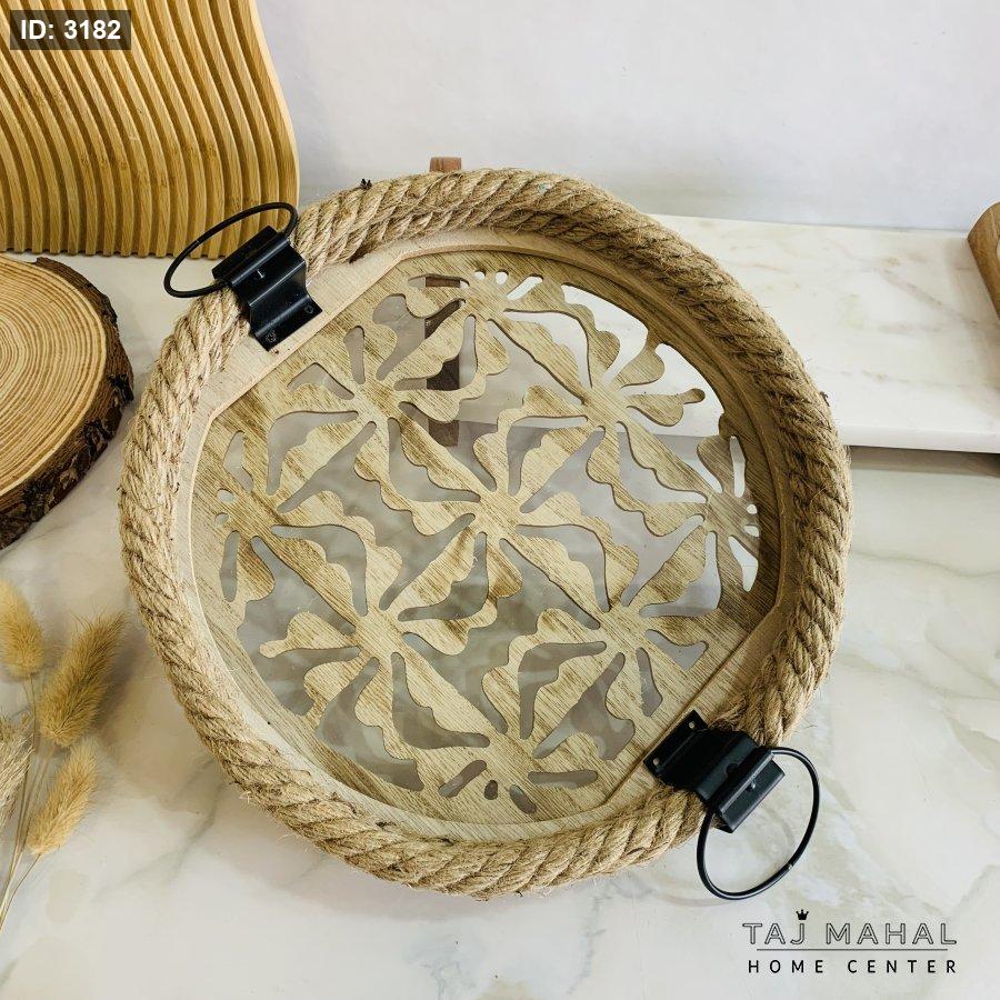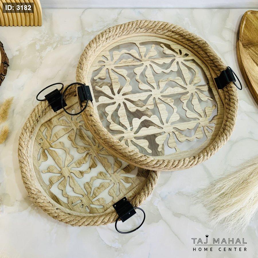طقم صينية تقديم خشبية دائرية بمقابض سوداء