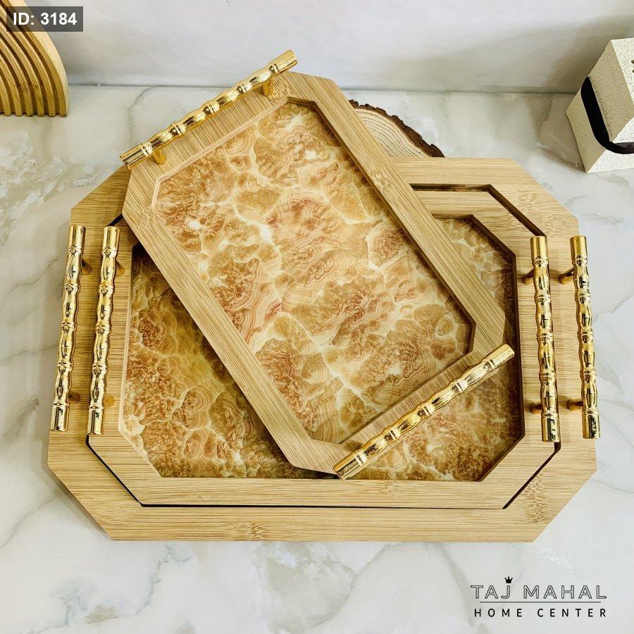 طقم ٣ صواني تقديم خشبية مع قاعدة شبيهة بالرخام
