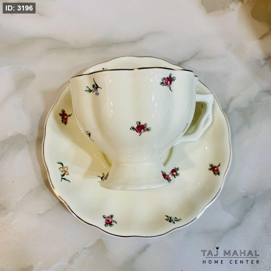- الأكواب والصحون مزينة بنقوش زهور ملونة صغيرة.