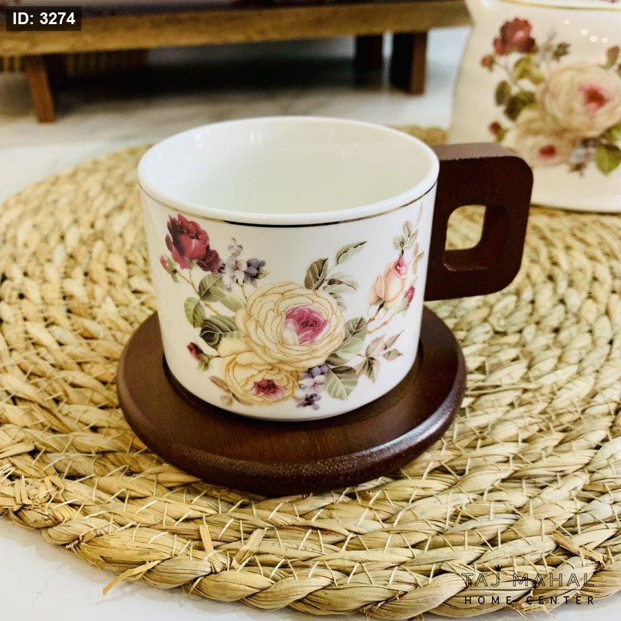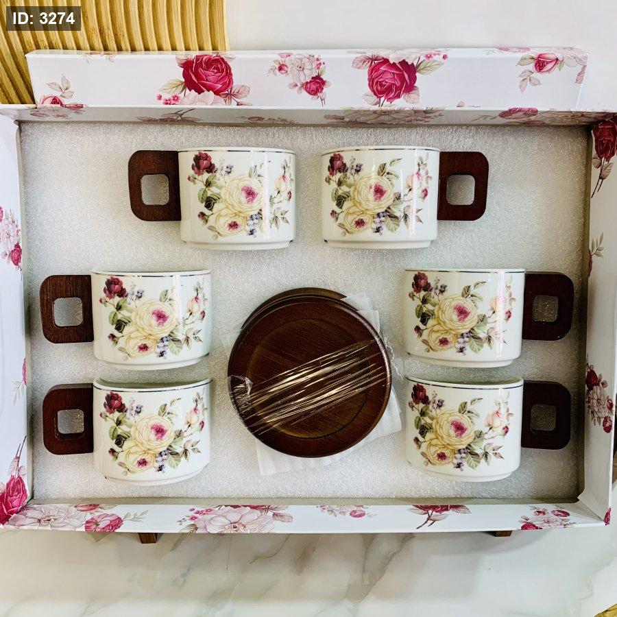 طقم ٦ اكواب شاي مورد بمقابض وقواعد خشبية