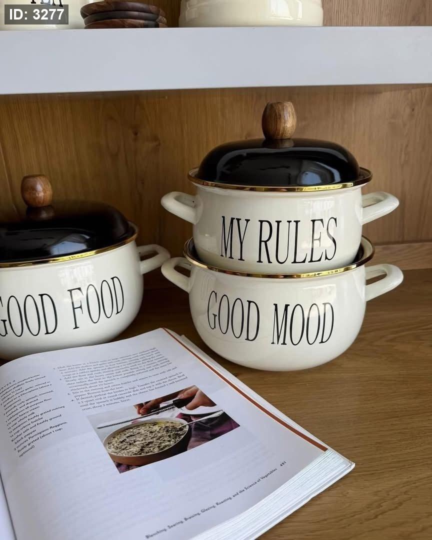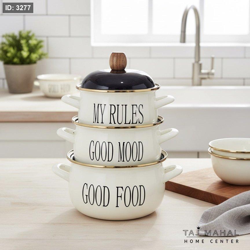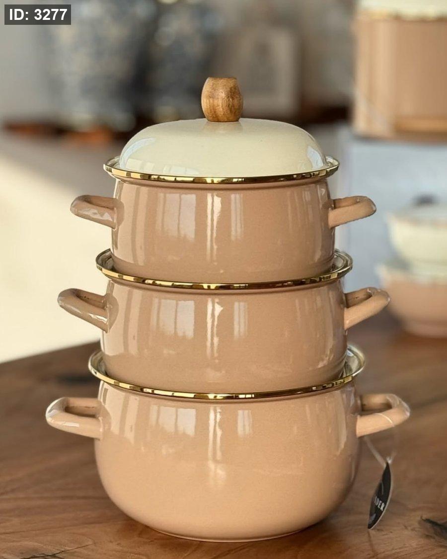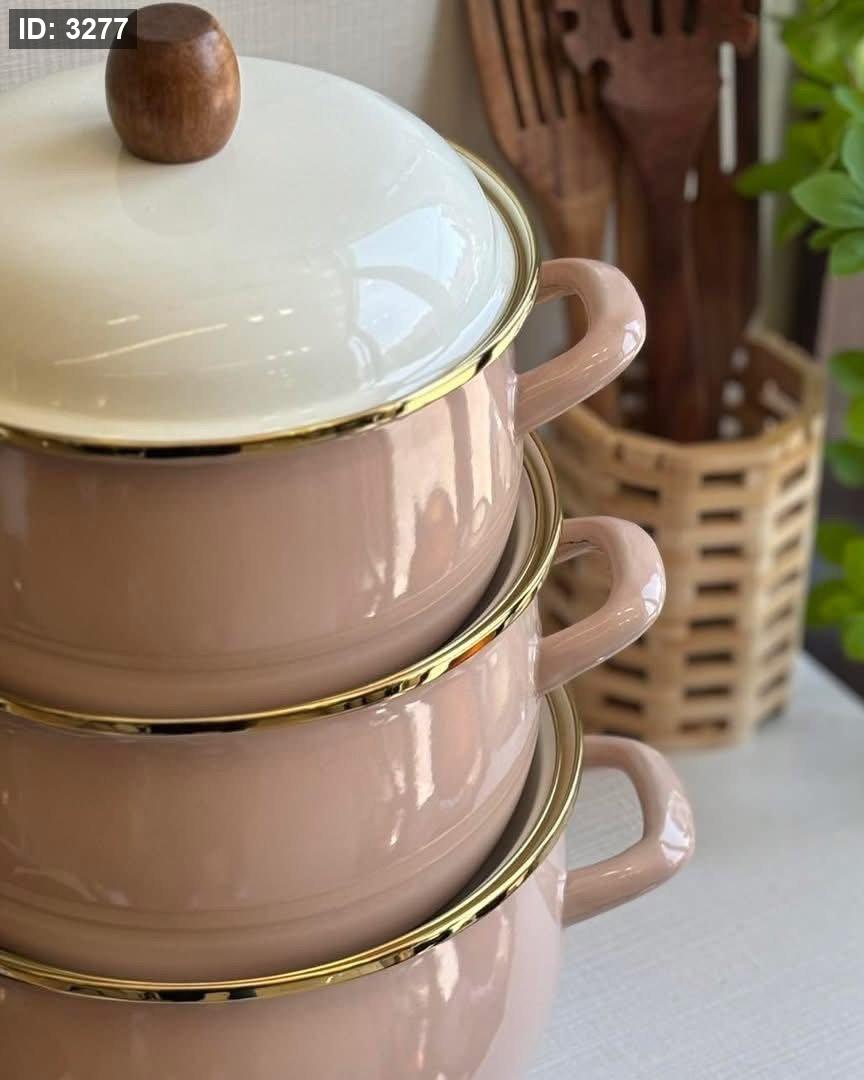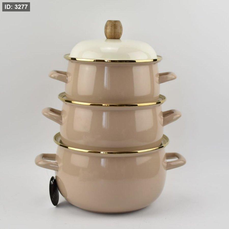 المحتويات: يتكون الطقم من 3 طناجر بأحجام مختلفة (20 سم، 22 سم، و18 سم)، مع أغطيتها.