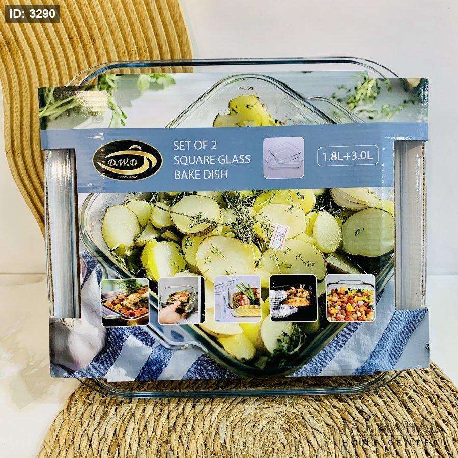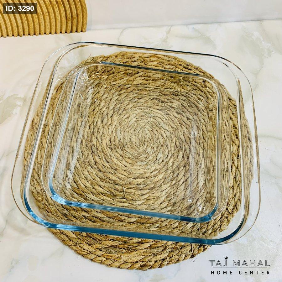 يحتوي الطقم على صينيتي بايركس زجاجيتين.