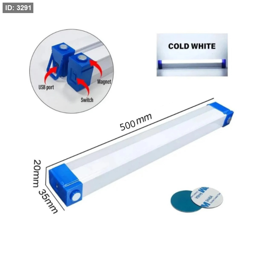 شريط إضاءة LED متعدد الاستخدامات بطول 50 سم، يوفر إضاءة بيضاء باردة وفعالة. يتميز بسهولة التثبيت الفوري بفضل قاعدته المغناطيسية ويدعم التشغيل المريح عبر منفذ USB، مما يجعله مناسباً لمختلف الأماكن مثل السيارات والخزائن والورش والمطابخ.