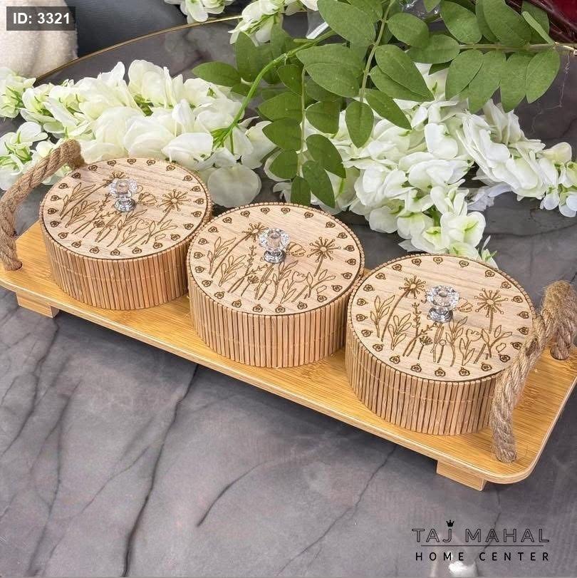 مضيفة ثلاث علب دائرية بغطاء خشبي مزخرف