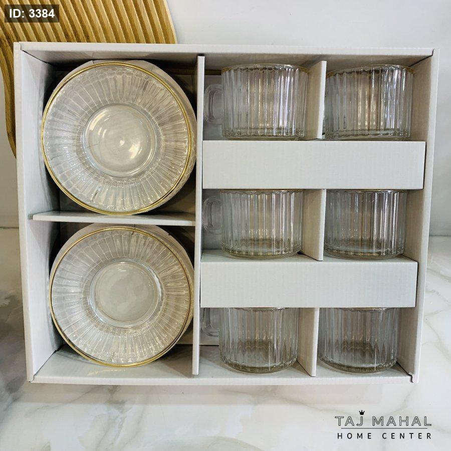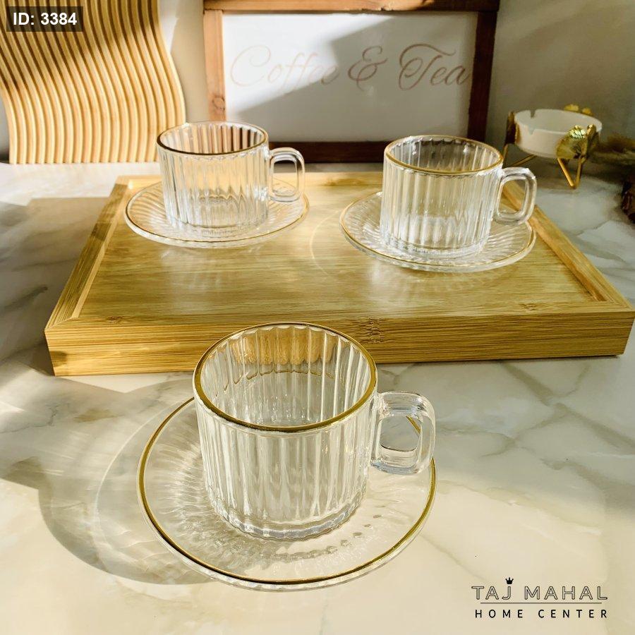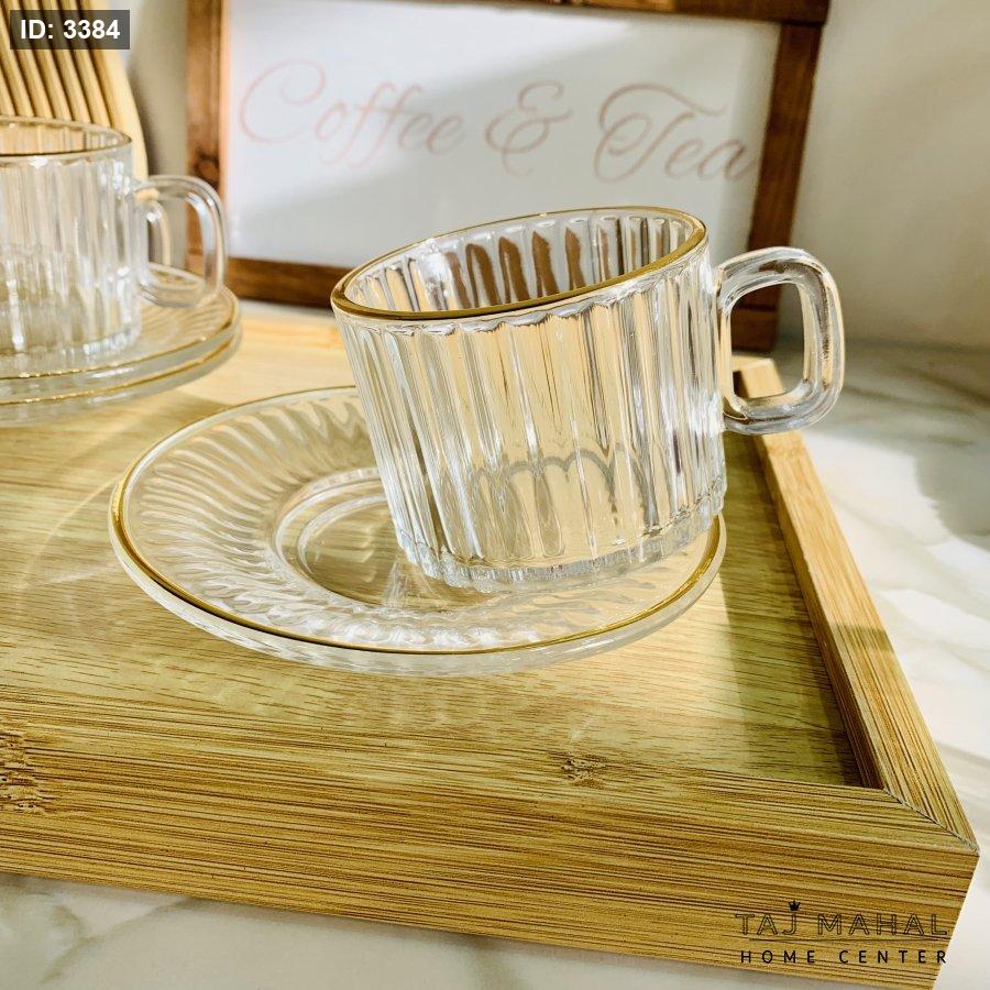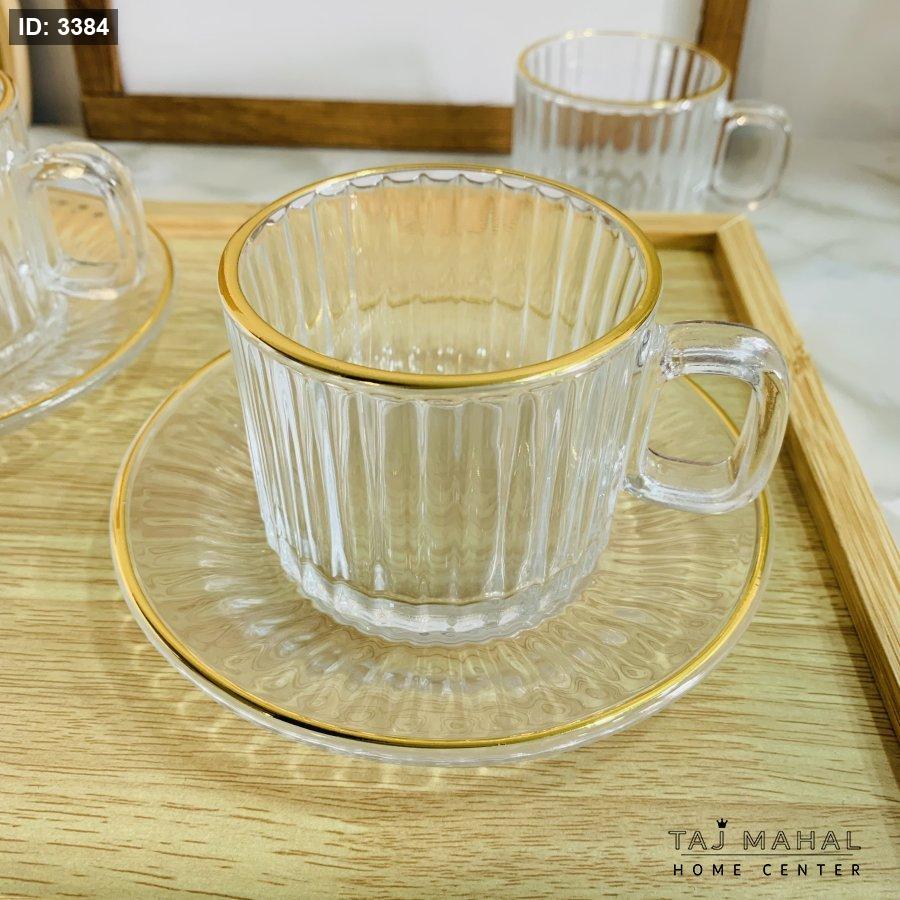 طقم ٦ كاسات شاي مع ٦ صحون محزز ذهبي