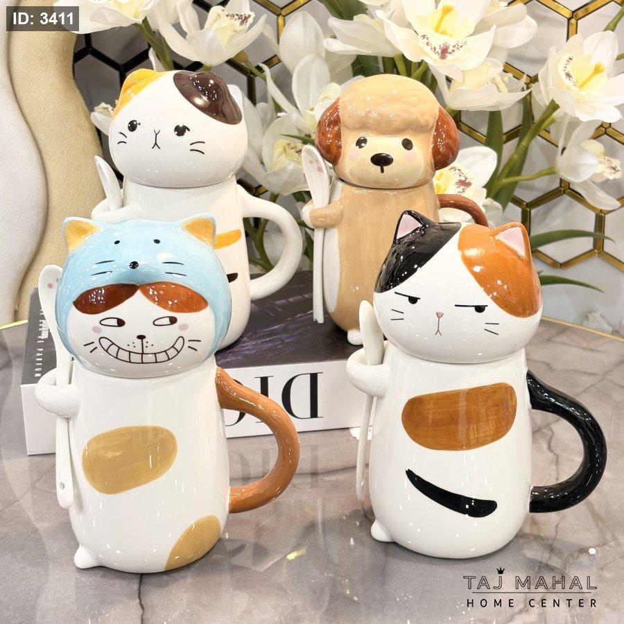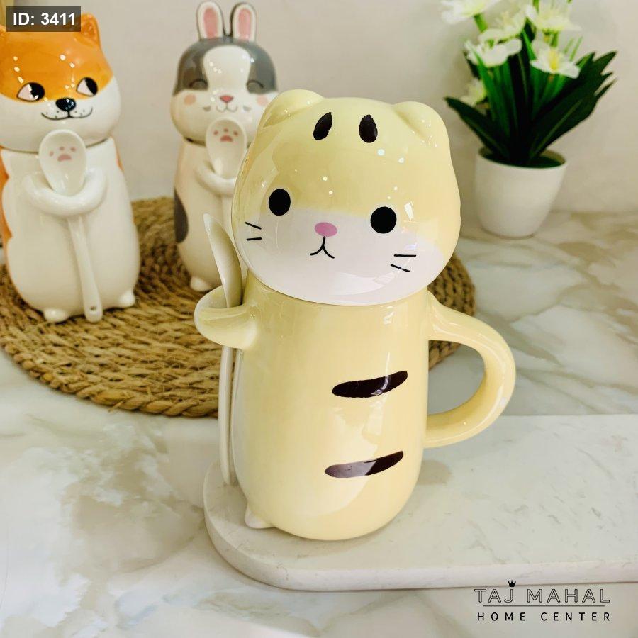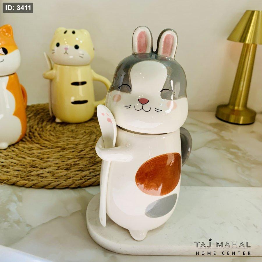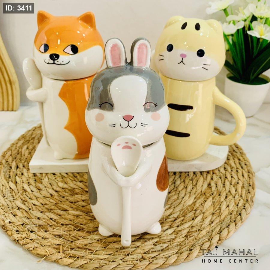مجات سيراميك لطيفة بتصاميم حيوانات مع ملعقة وغطاء