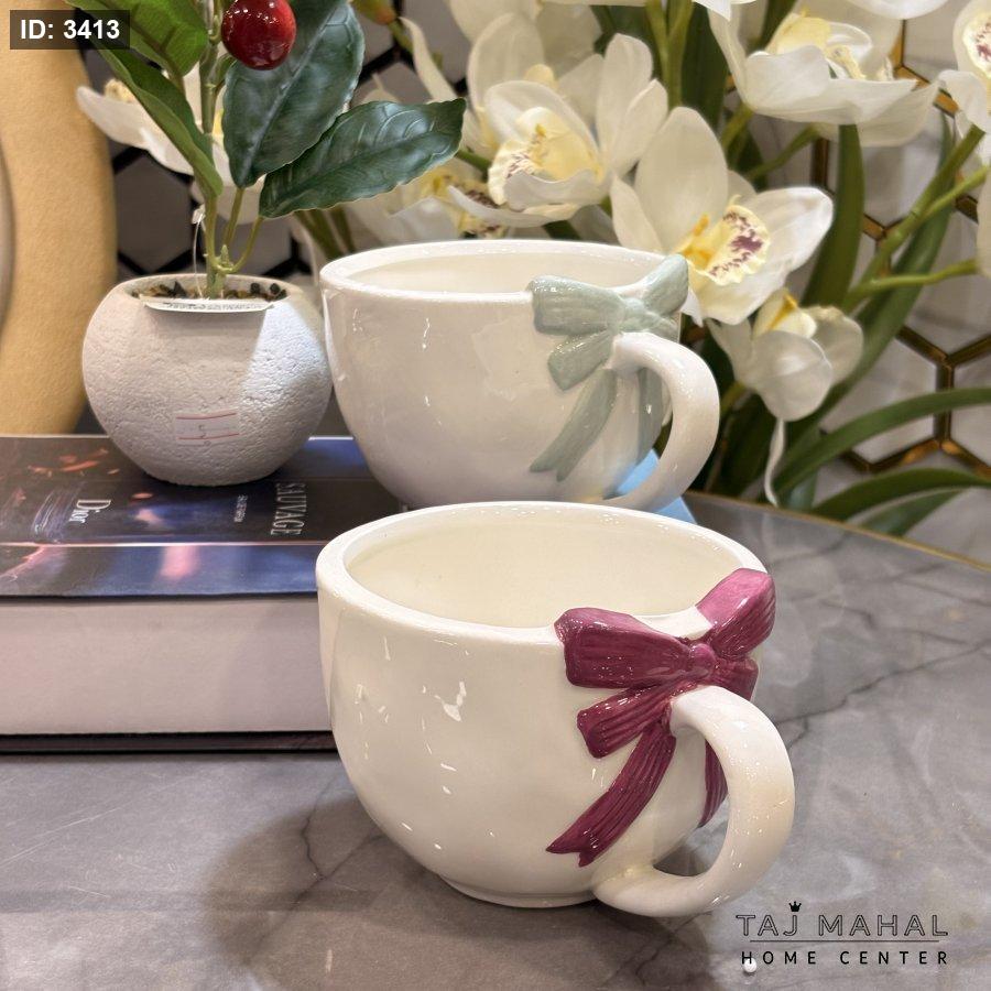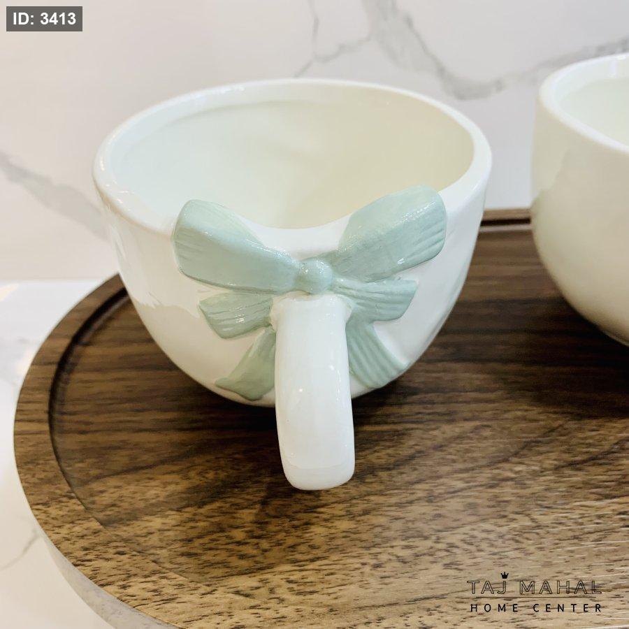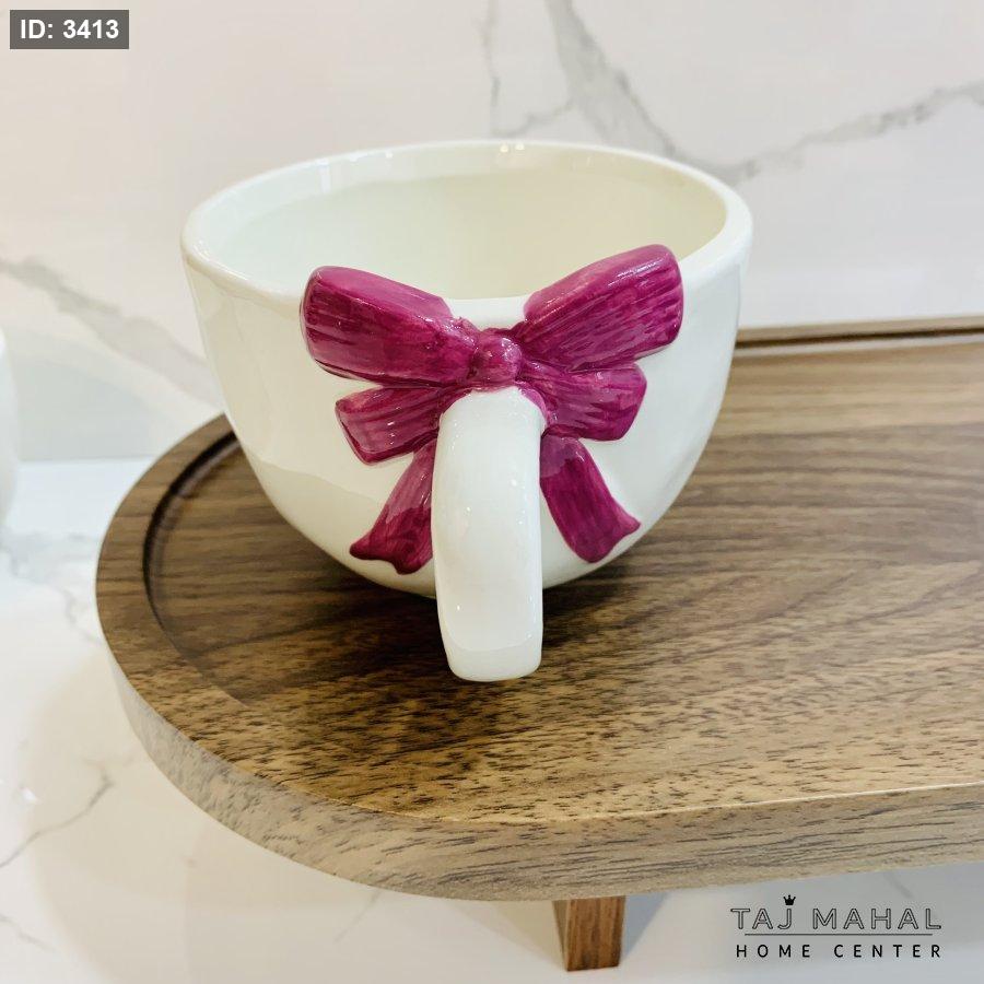 مج سيراميك أبيض مع مقبض دائري مزين بفيونكة