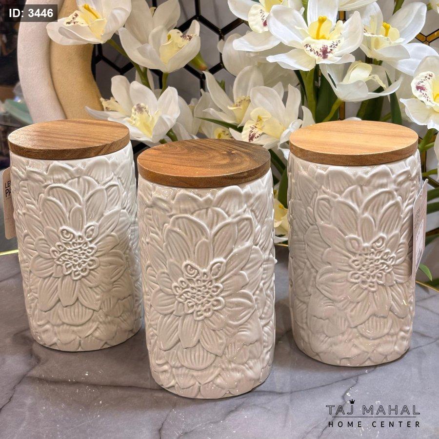 طقم 3 علب سيراميك ابيض بغطاء خشبي