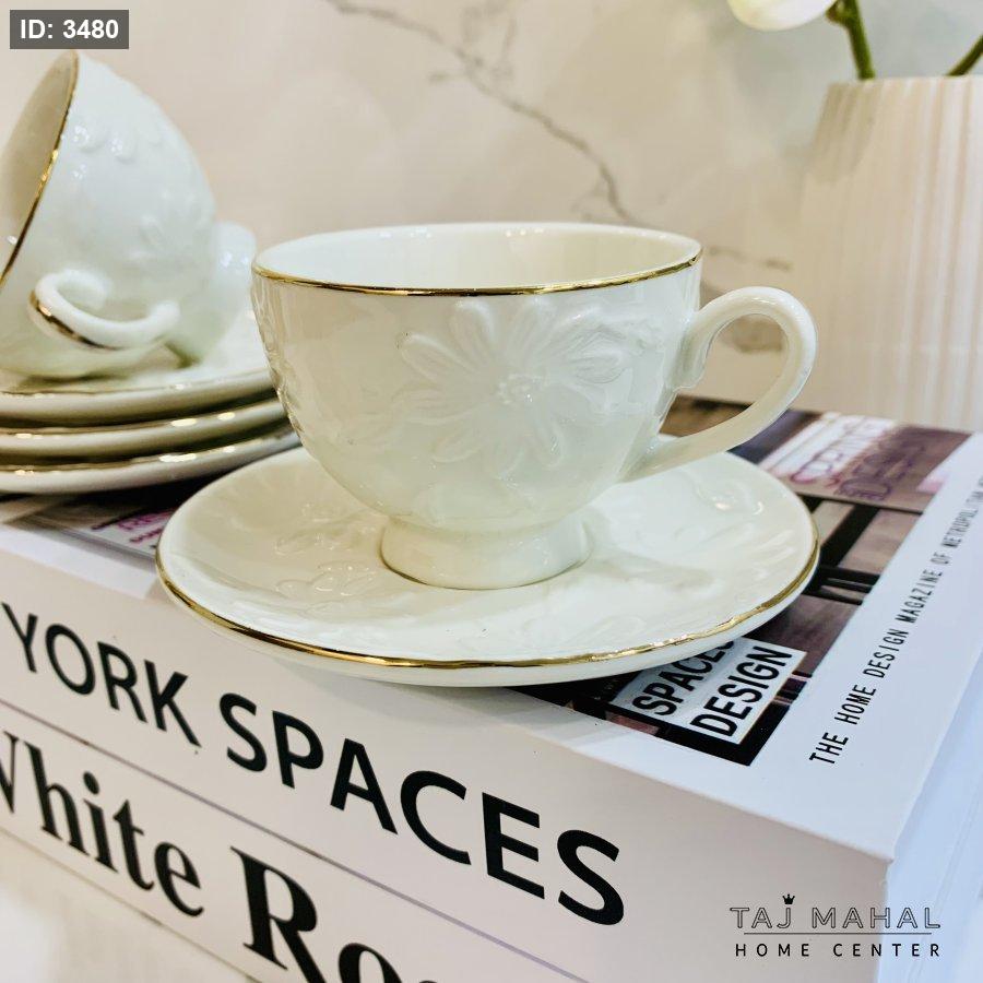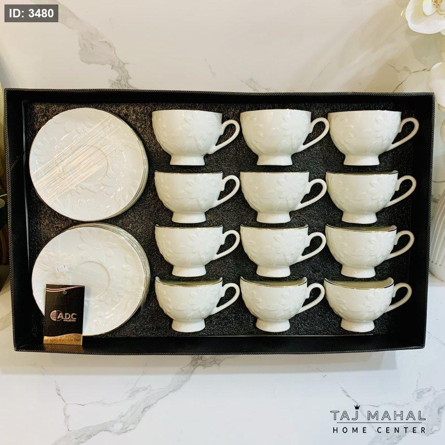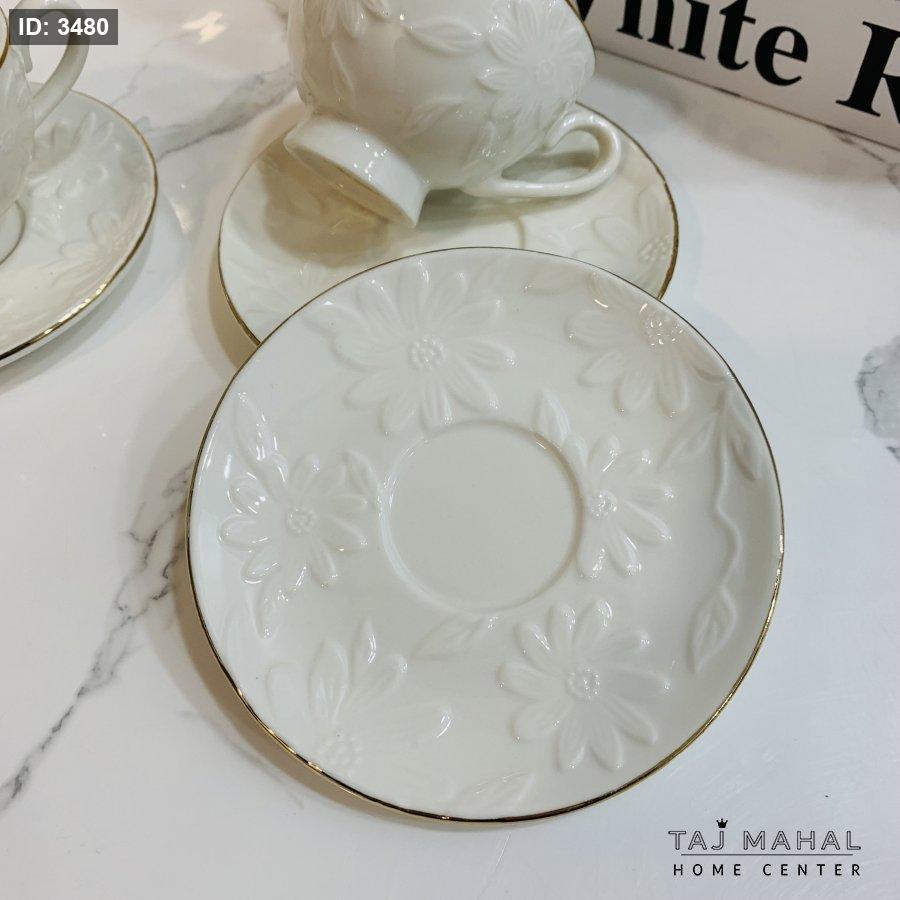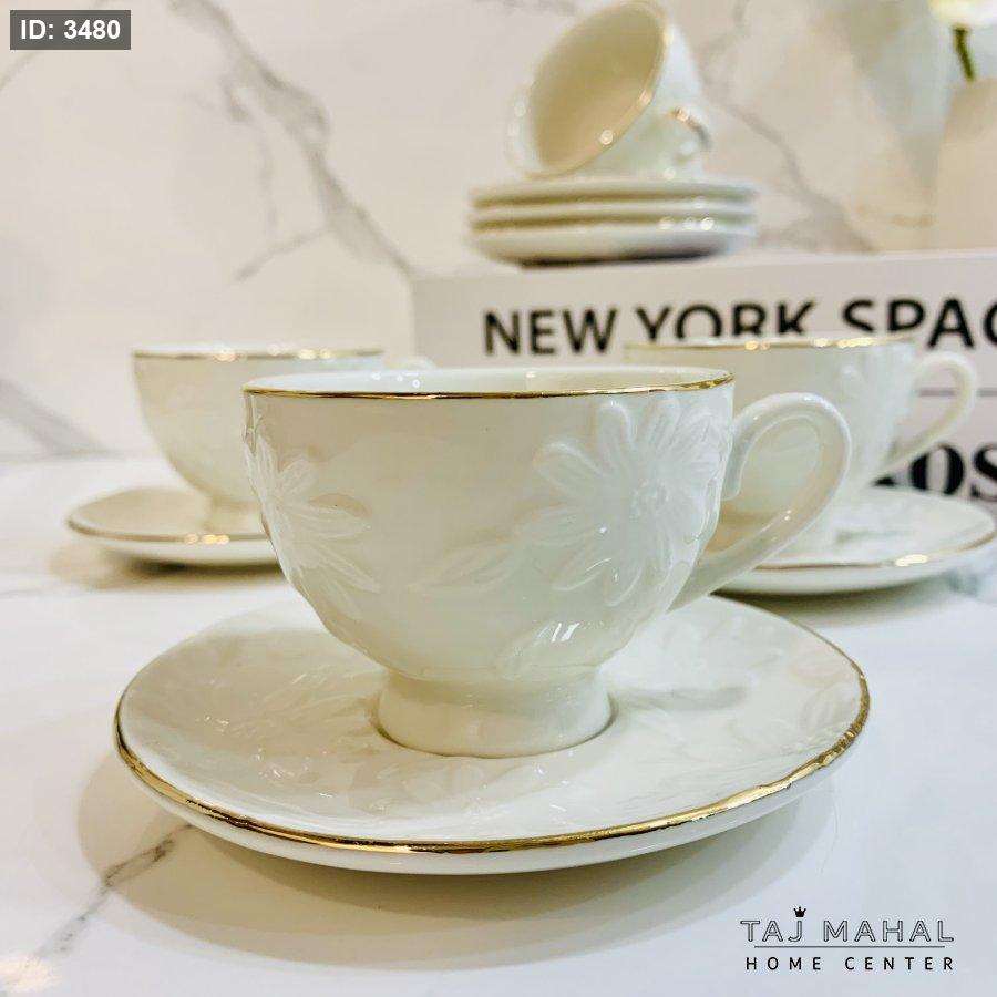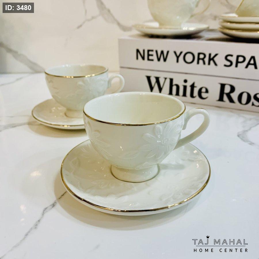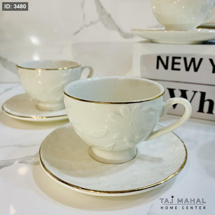 طقم ١٢ فنجان قهوة و ١٢ صحن بلون أبيض ونقوش زهور بارزة وحافة ذهبية