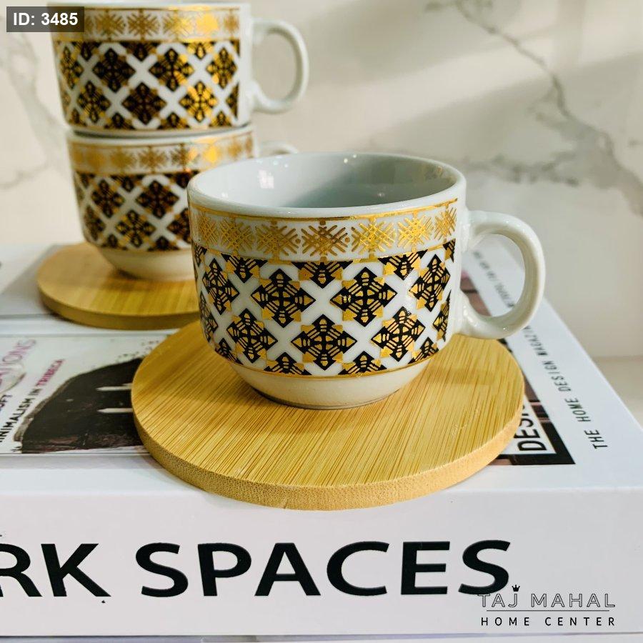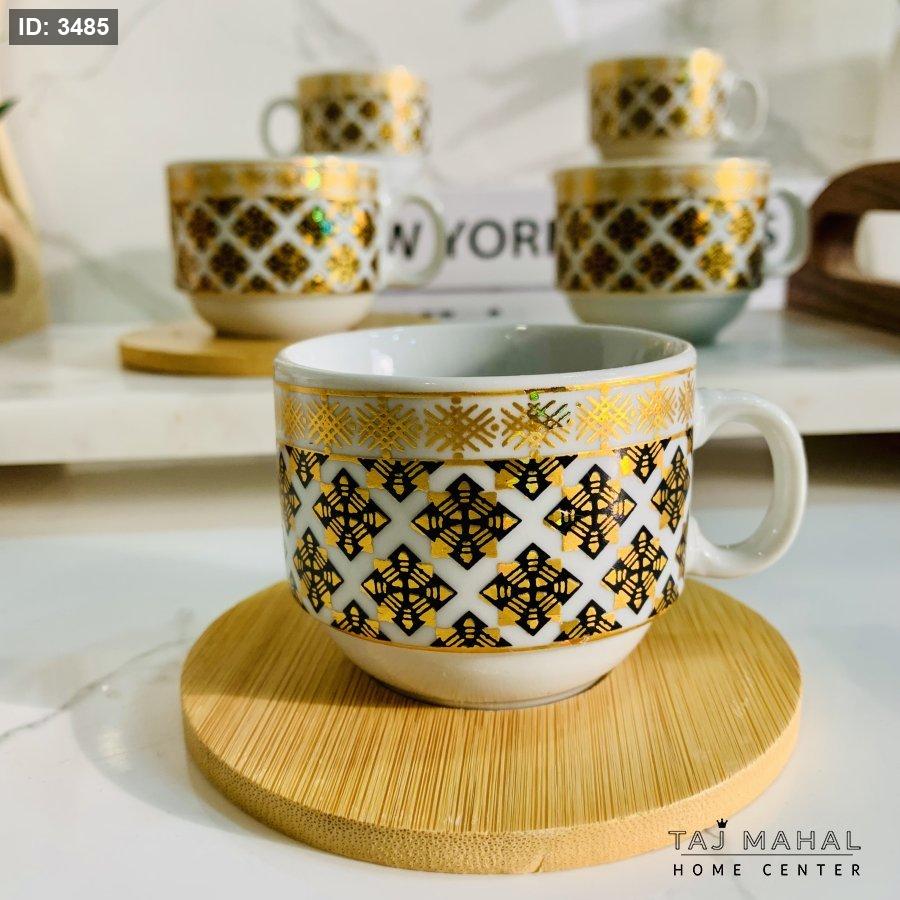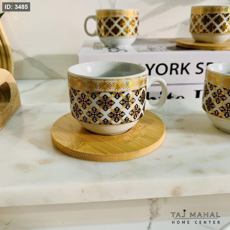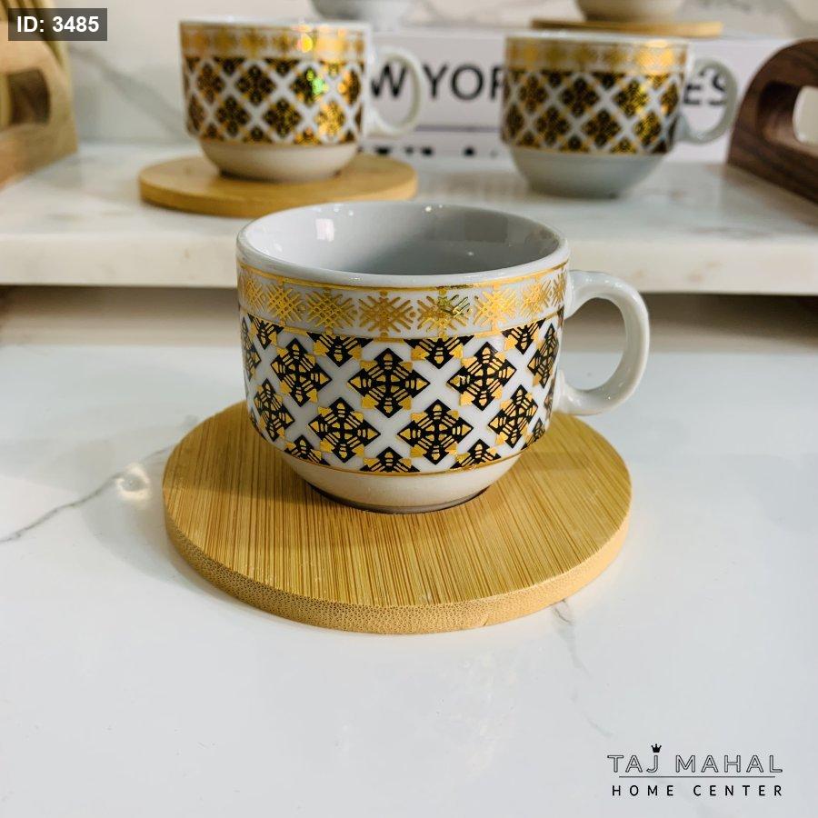 طقم 6 فناجين قهوة بورسلان مع قاعدة خشبية ذهبي وأسود