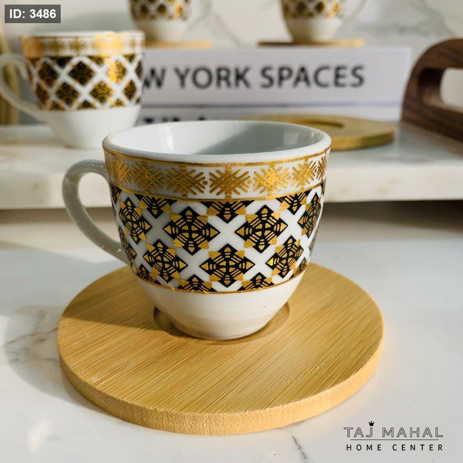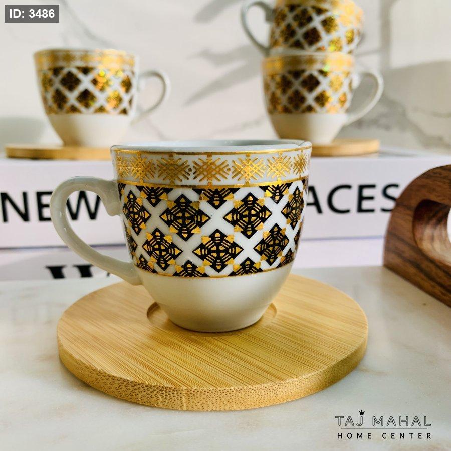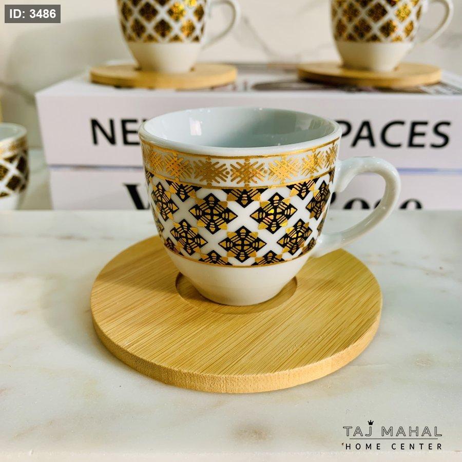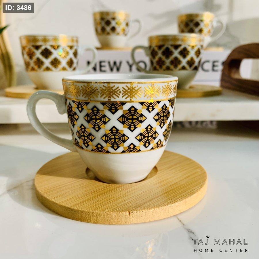 طقم فناجين بورسلان مع قاعدة خشبية 6 قطع ذهبي وأسود