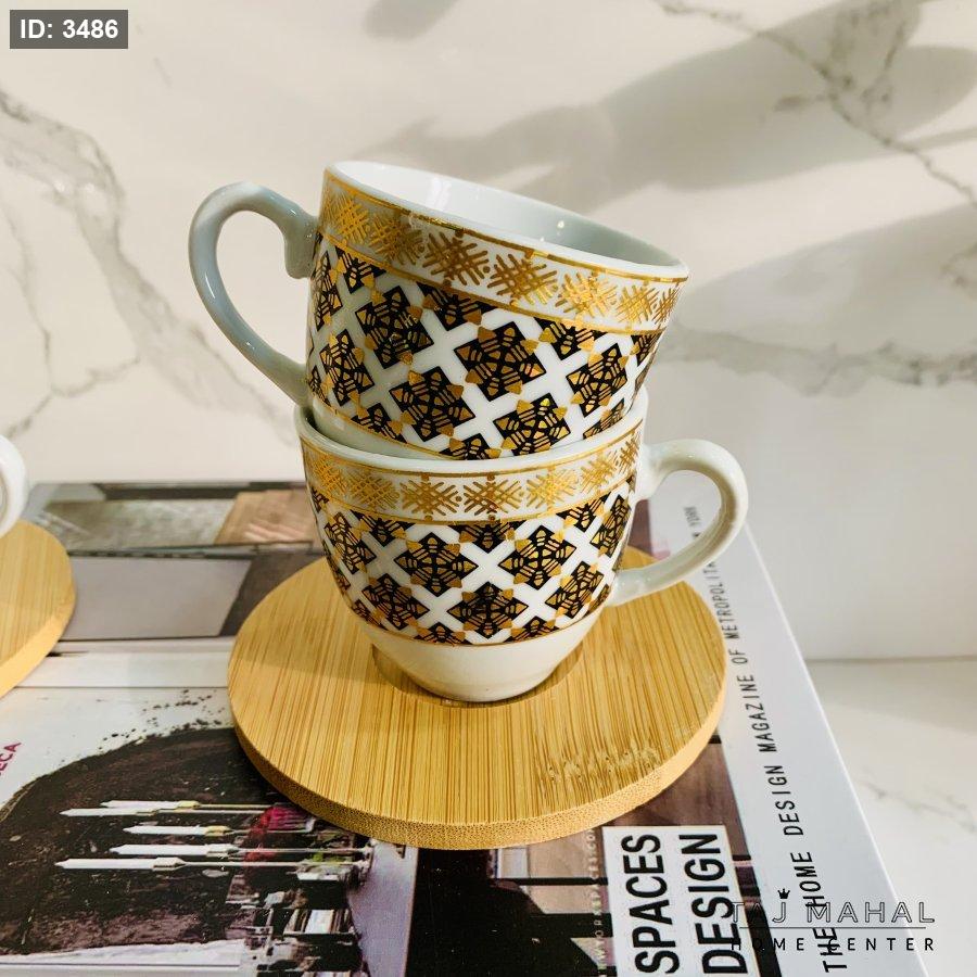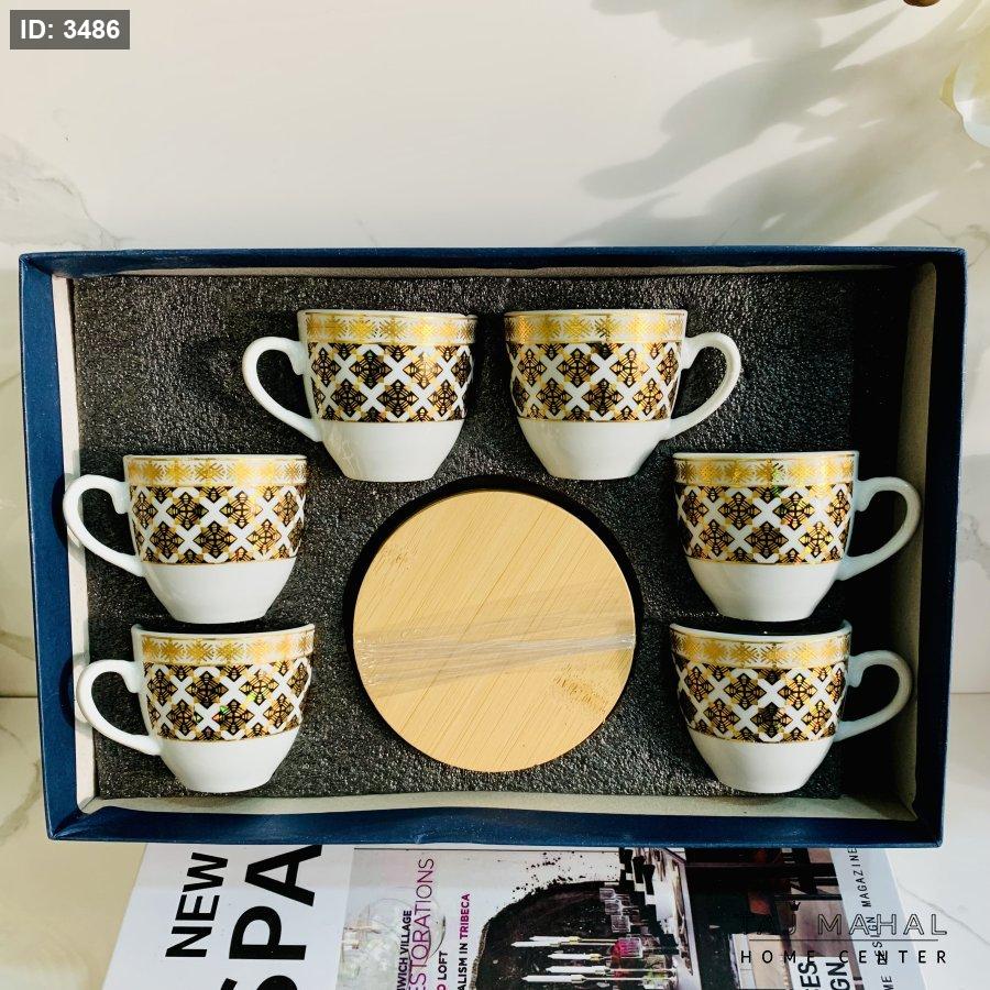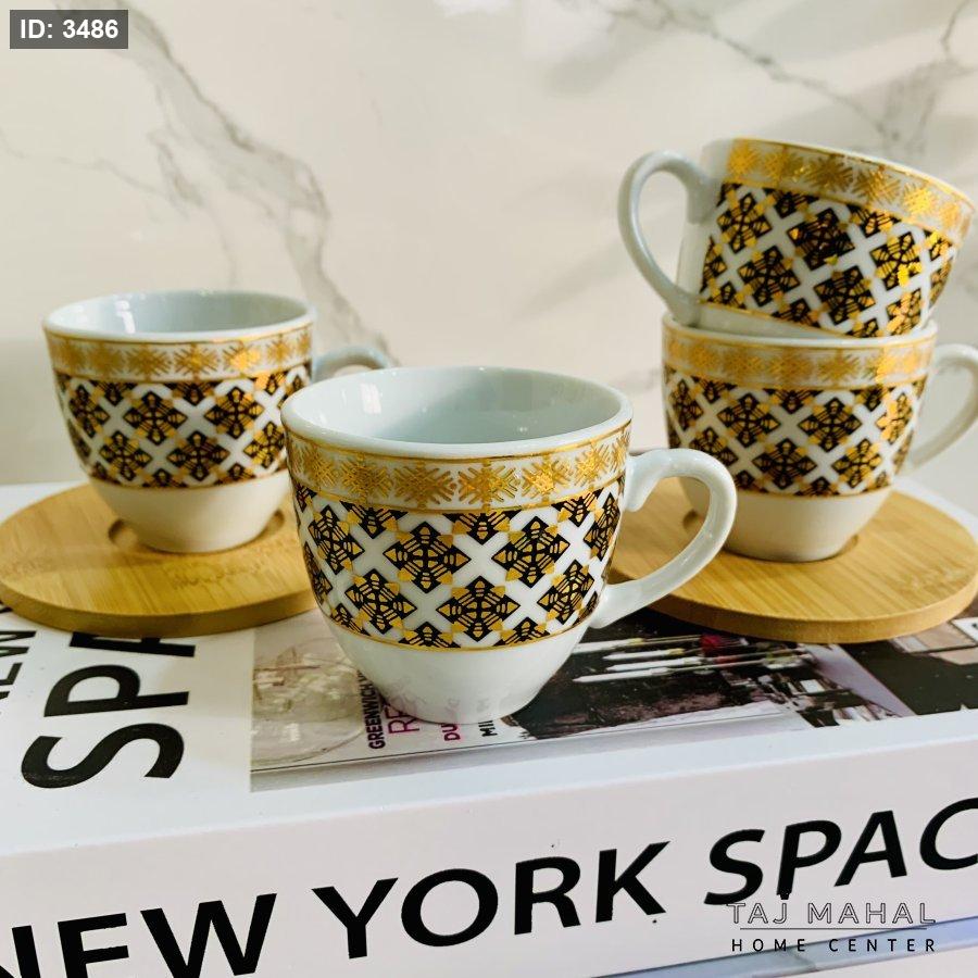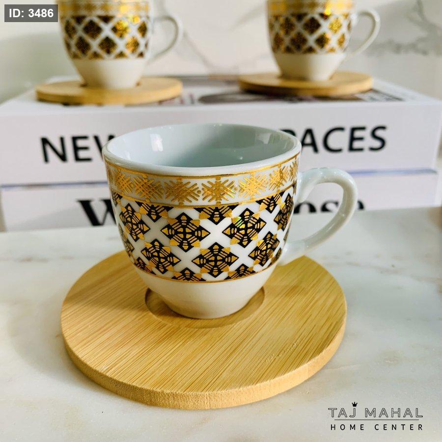 طقم فناجين بورسلان مع قاعدة خشبية 6 قطع ذهبي وأسود