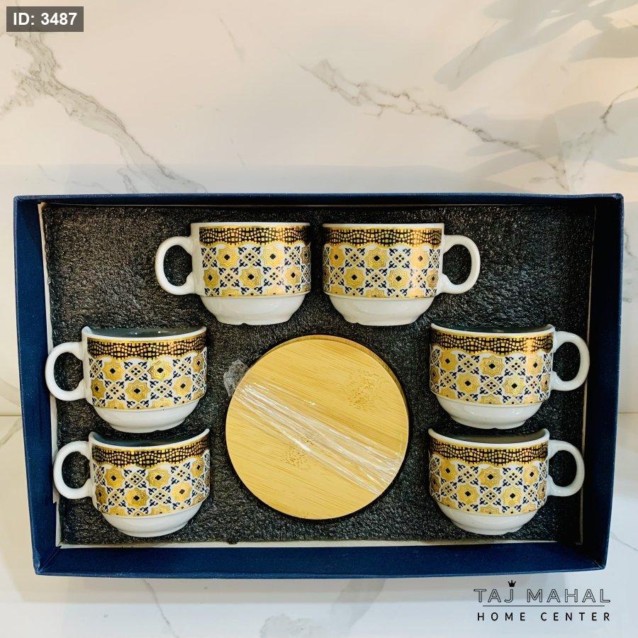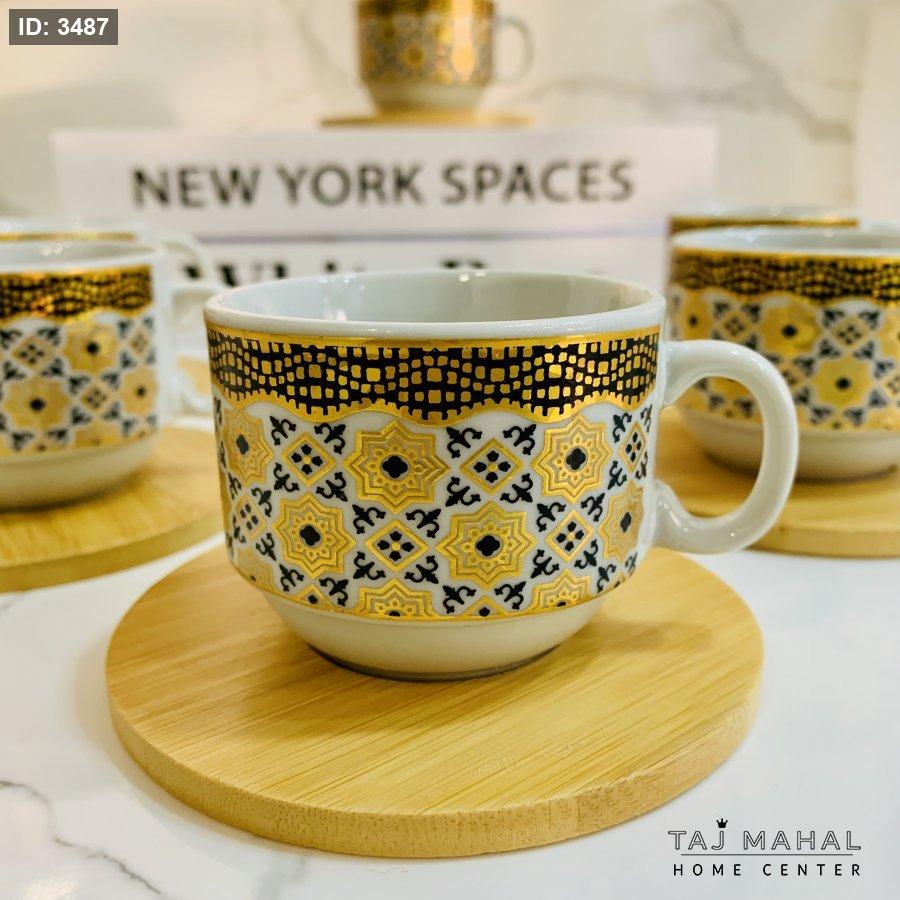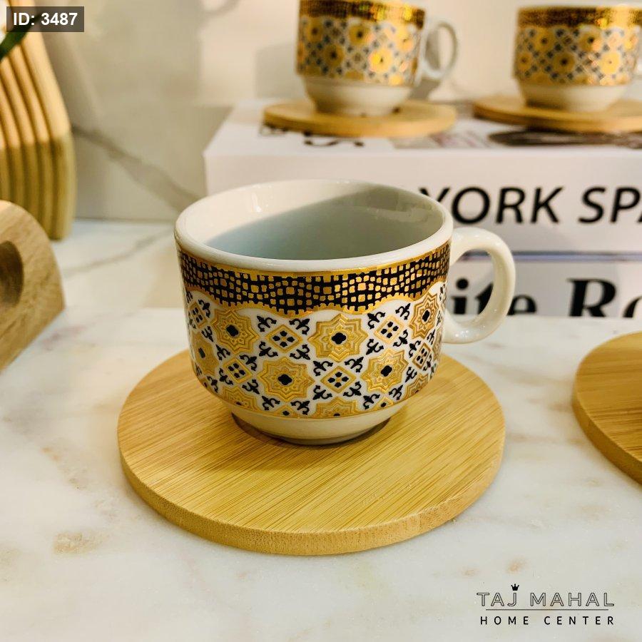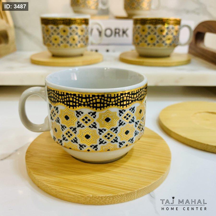 طقم فناجين قهوة مع قاعدة خشبية 6 قطع مع نقش ذهبي وأسود