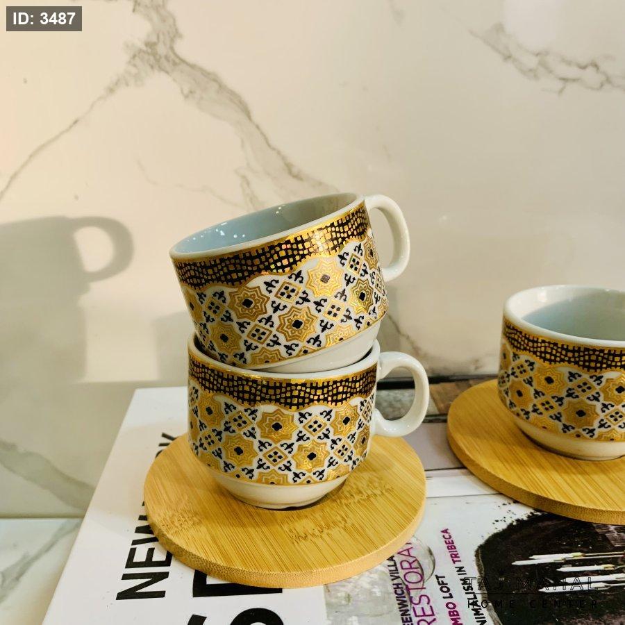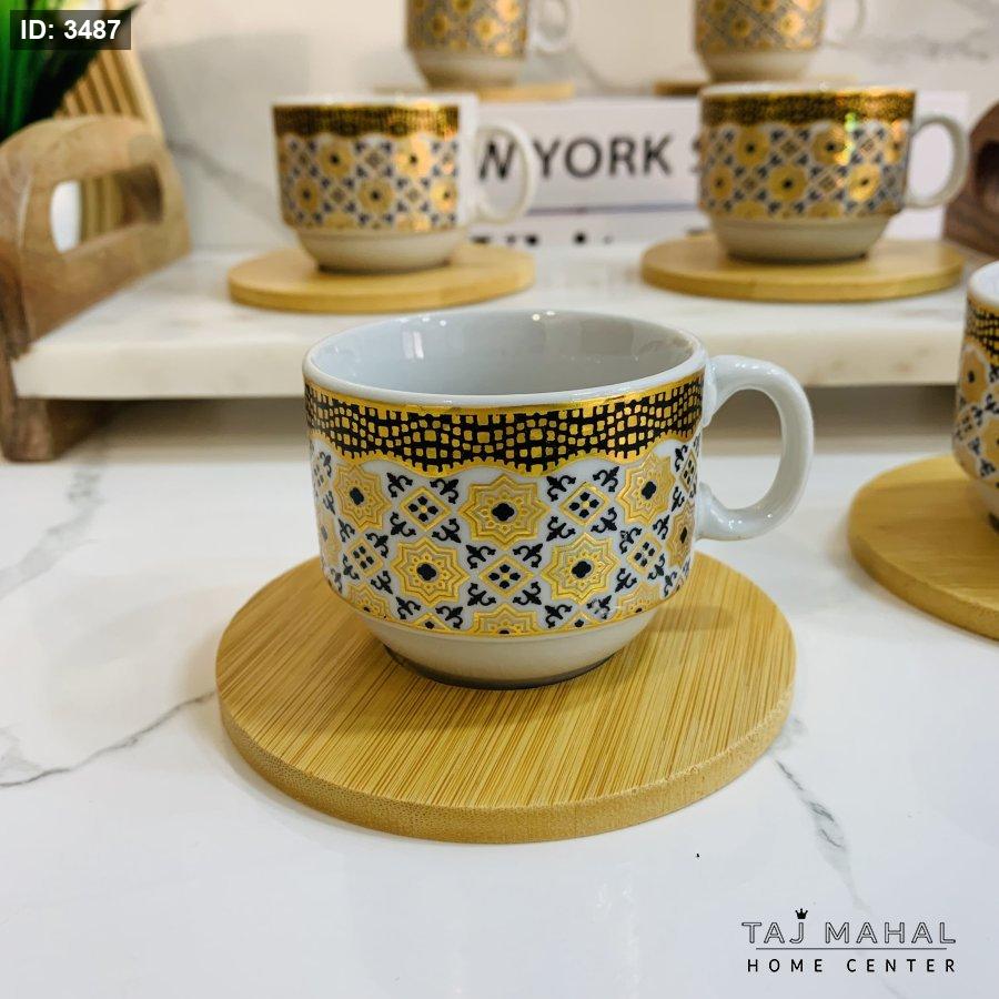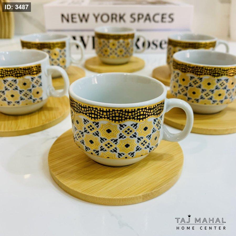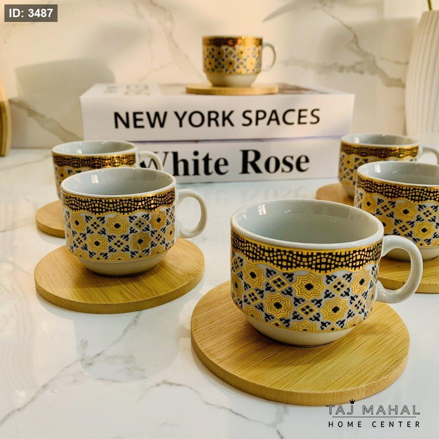 طقم فناجين قهوة مع قاعدة خشبية 6 قطع مع نقش ذهبي وأسود