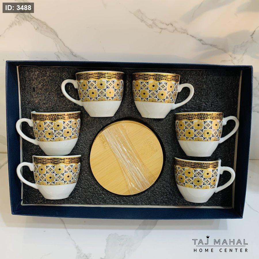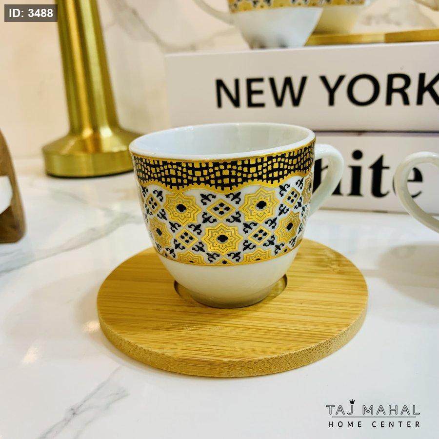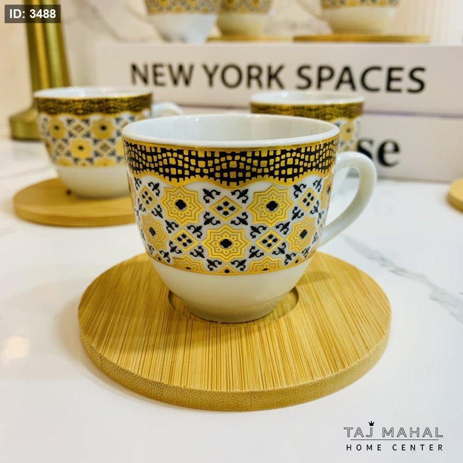طقم 6 فناجين بورسلان مع قاعدة خشبية لون ذهبي وأسود