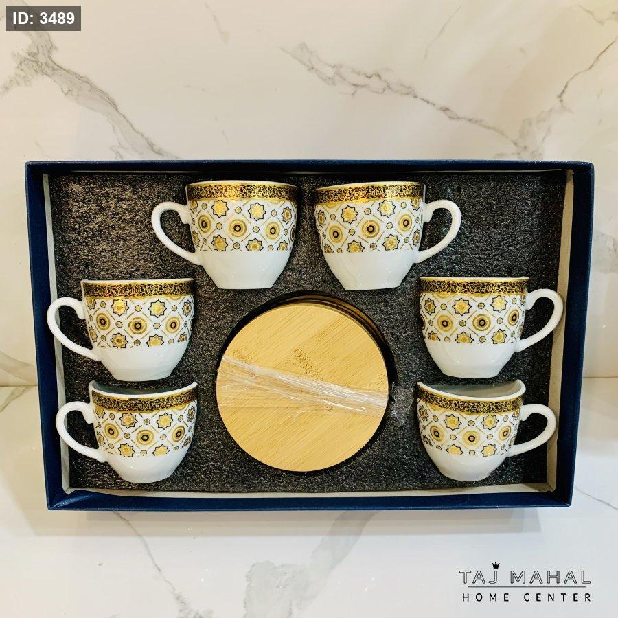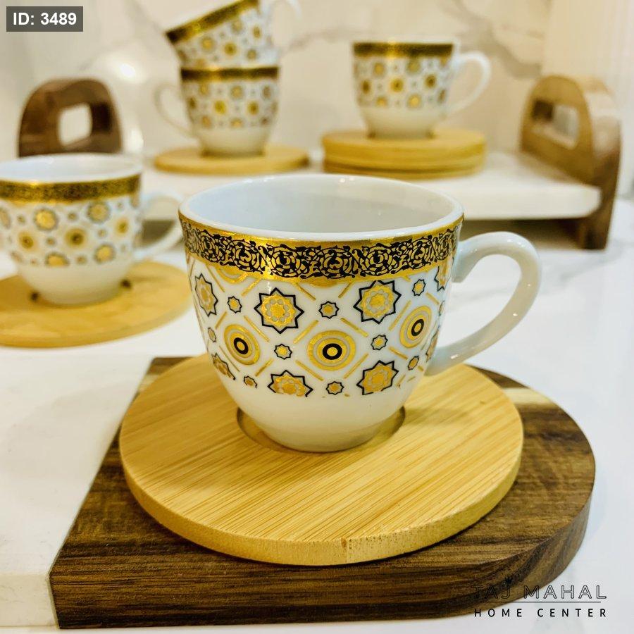 طقم 6 فناجين بورسلان بنقش ذهبي وأسود مع قاعدة خشبية