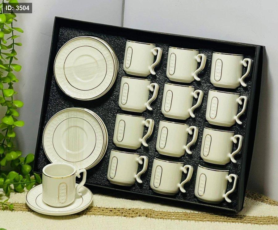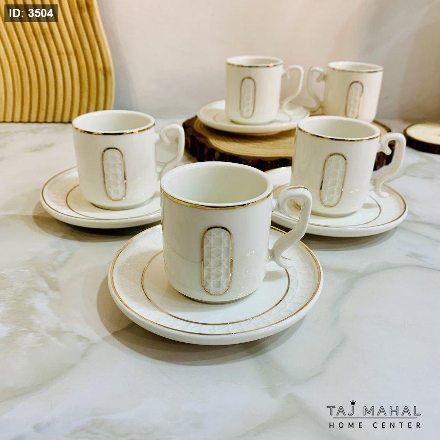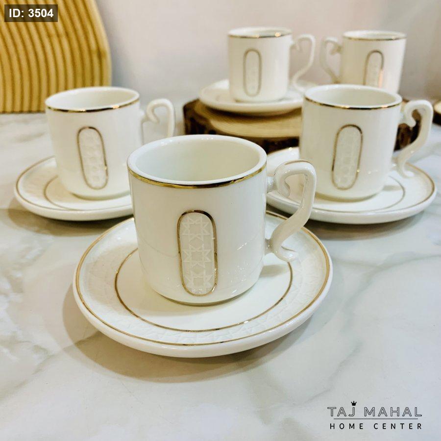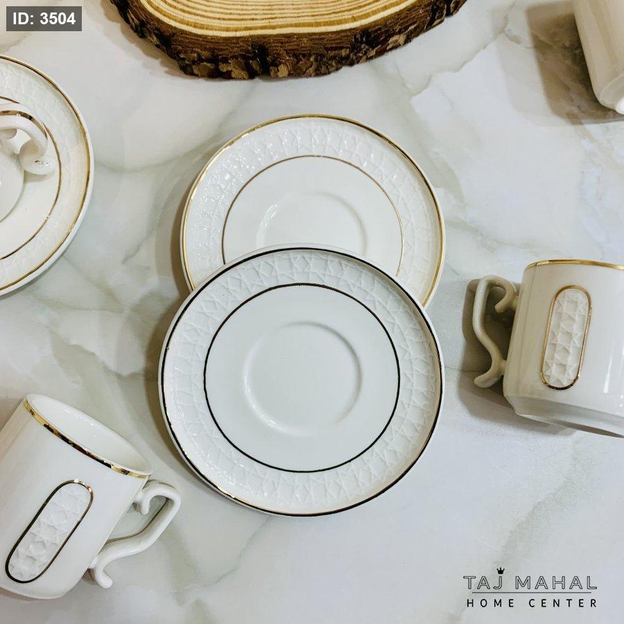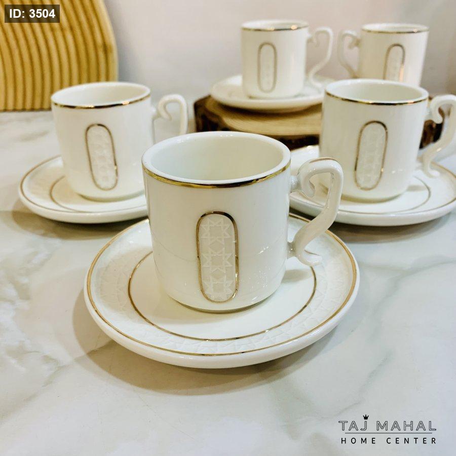 طقم 12 فنجان قهوة بورسلان أبيض مزخرف مع خطوط ذهبية