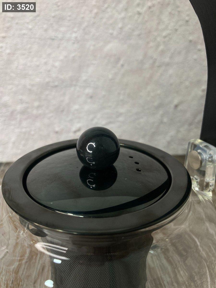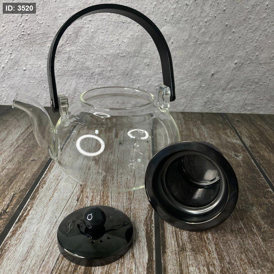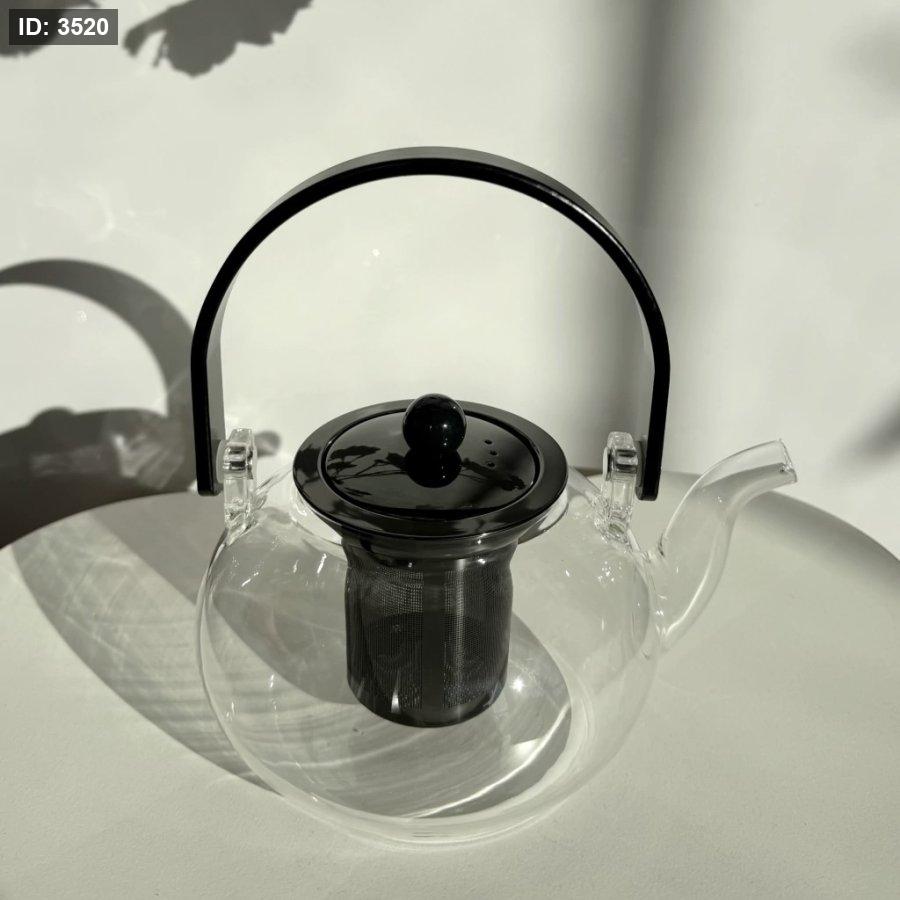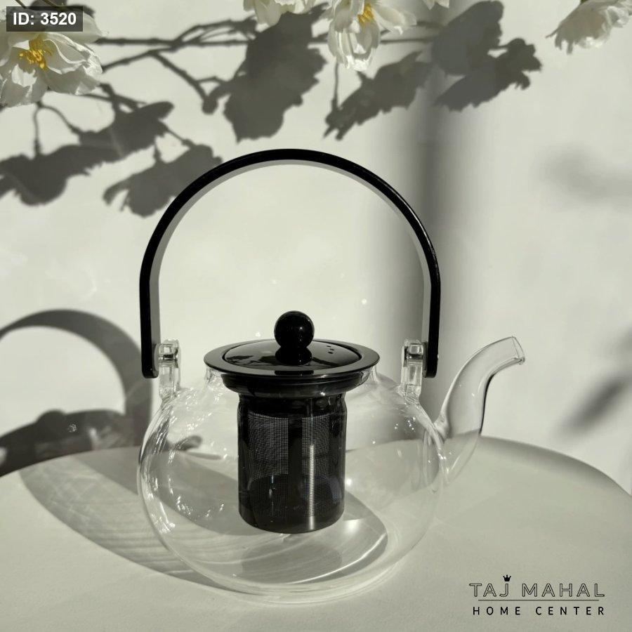 إبريق شاي زجاجي أنيق، شفاف ومتين، مصنوع من زجاج البورسليكات المقاوم للحرارة. يأتي مع مصفاة شبكية داخلية من الستانلس وغطاء ومقبض علوي باللون الأسود.
