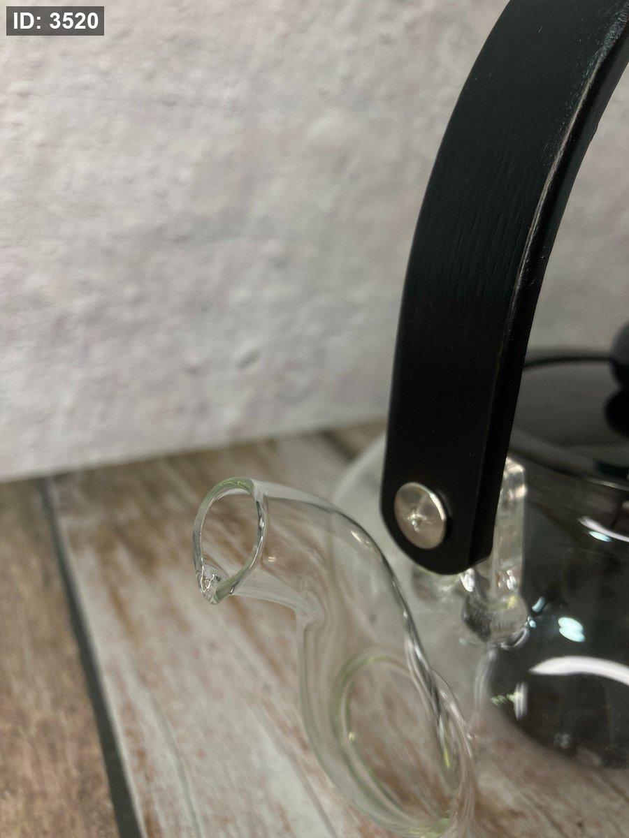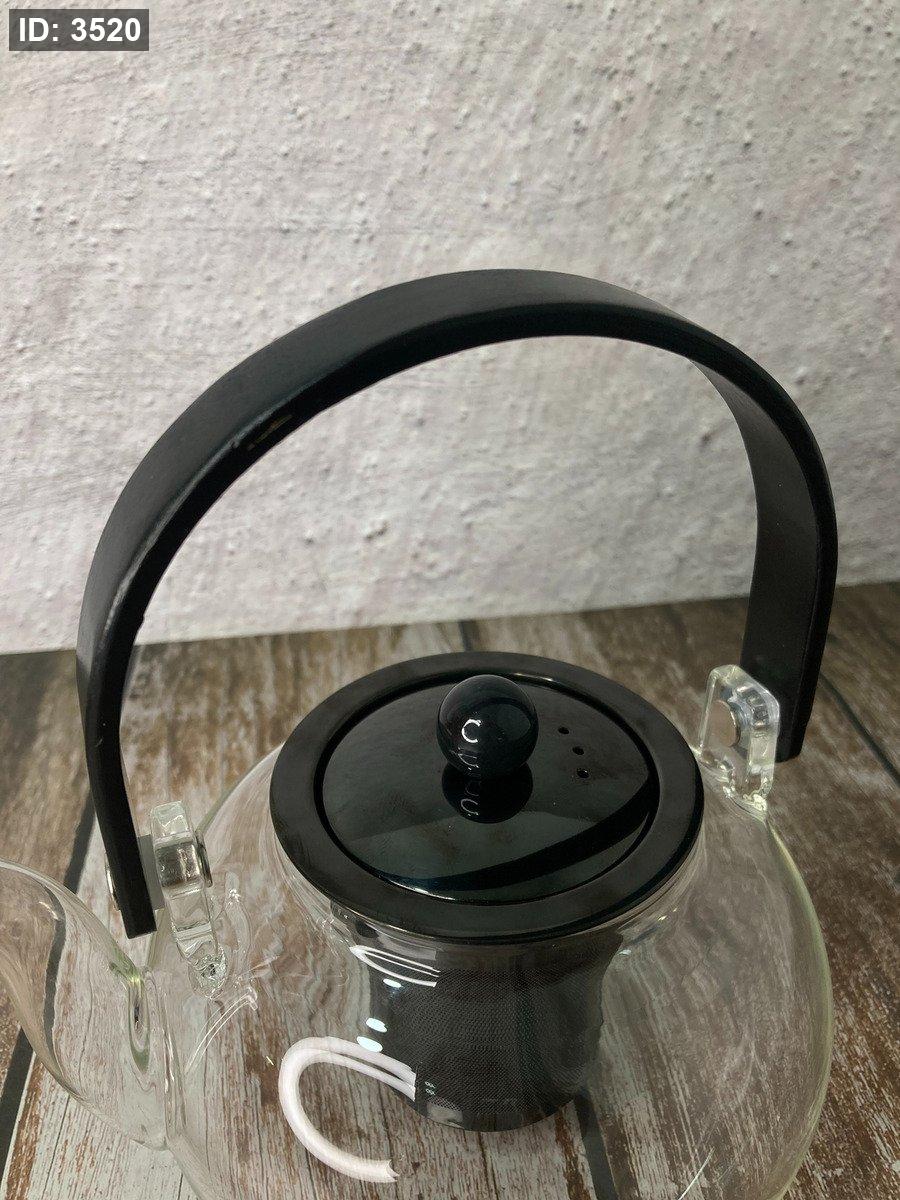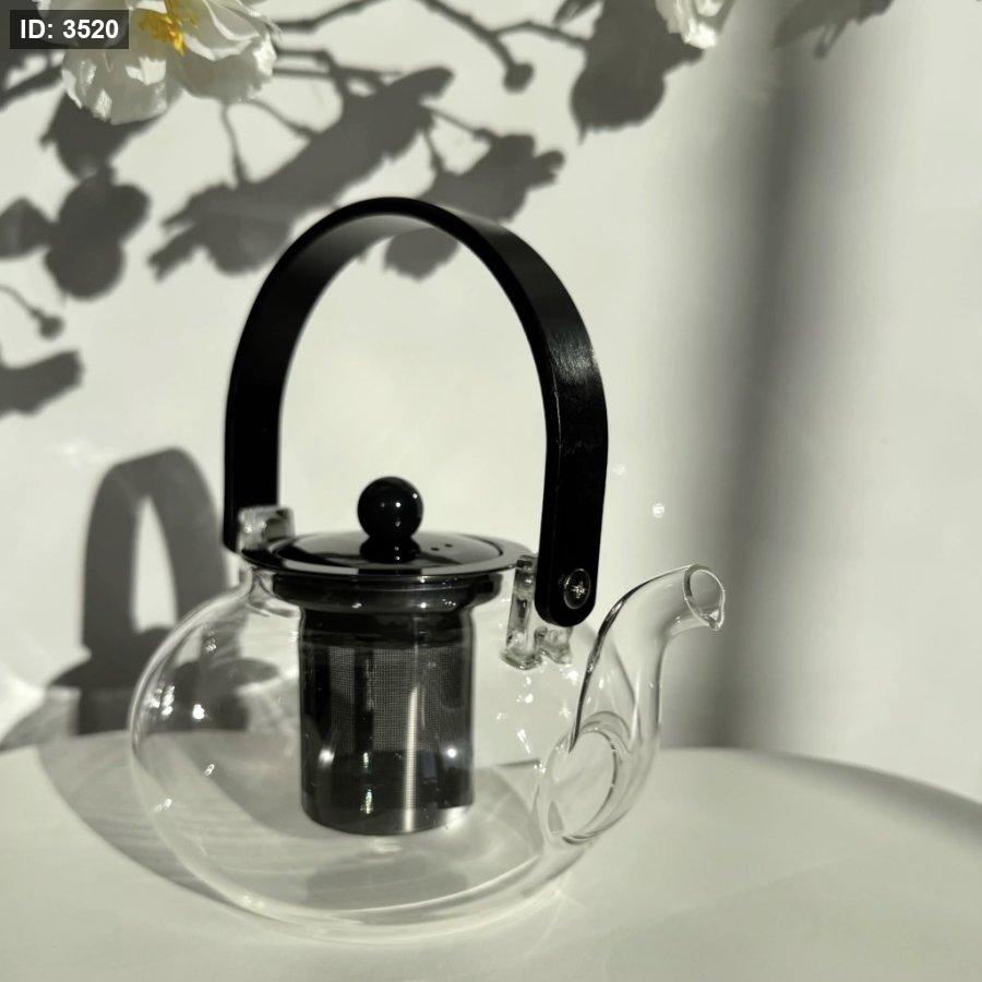 إبريق شاي زجاجي أنيق، شفاف ومتين، مصنوع من زجاج البورسليكات المقاوم للحرارة. يأتي مع مصفاة شبكية داخلية من الستانلس وغطاء ومقبض علوي باللون الأسود.