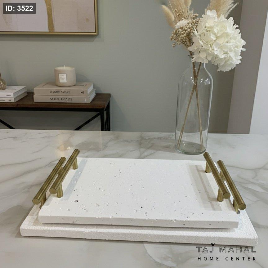 صواني تقديم مستطيلة بيضاء بمقابض ذهبية