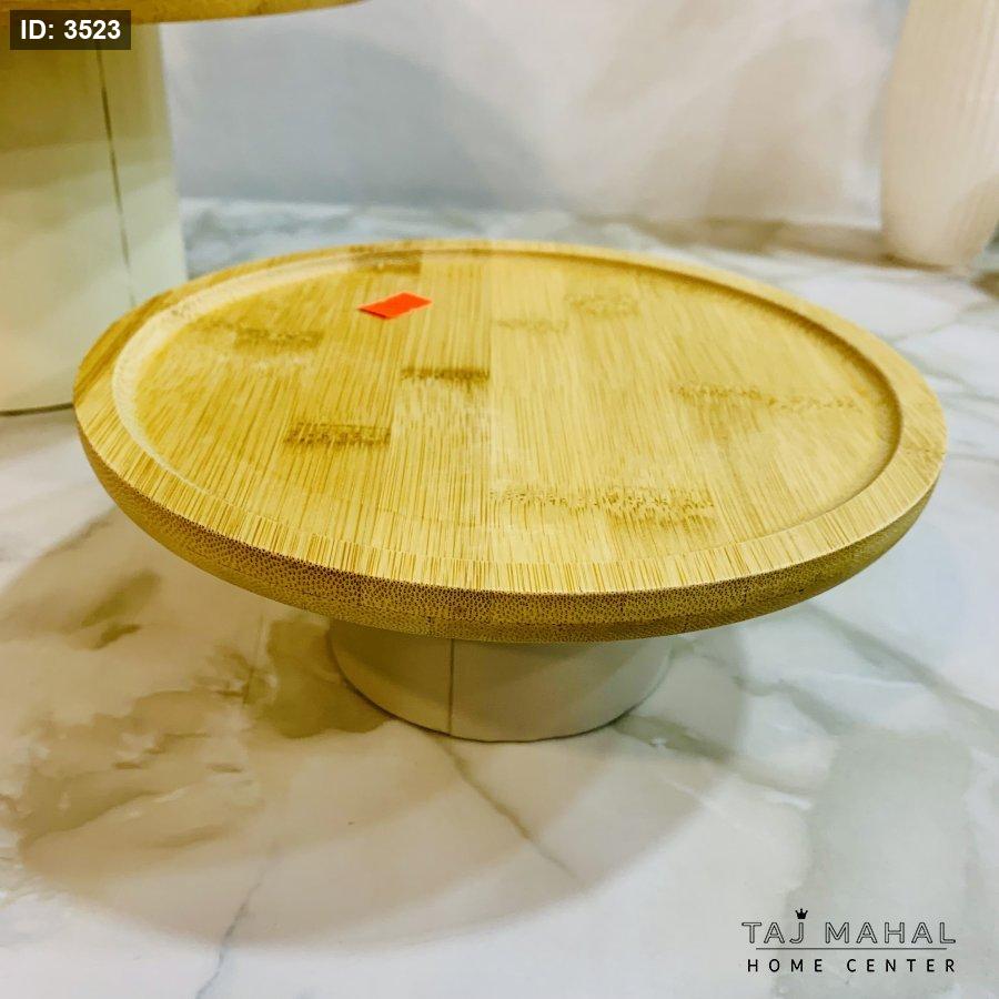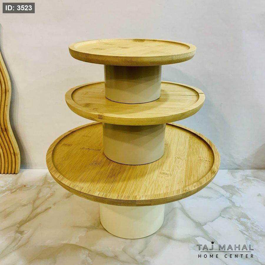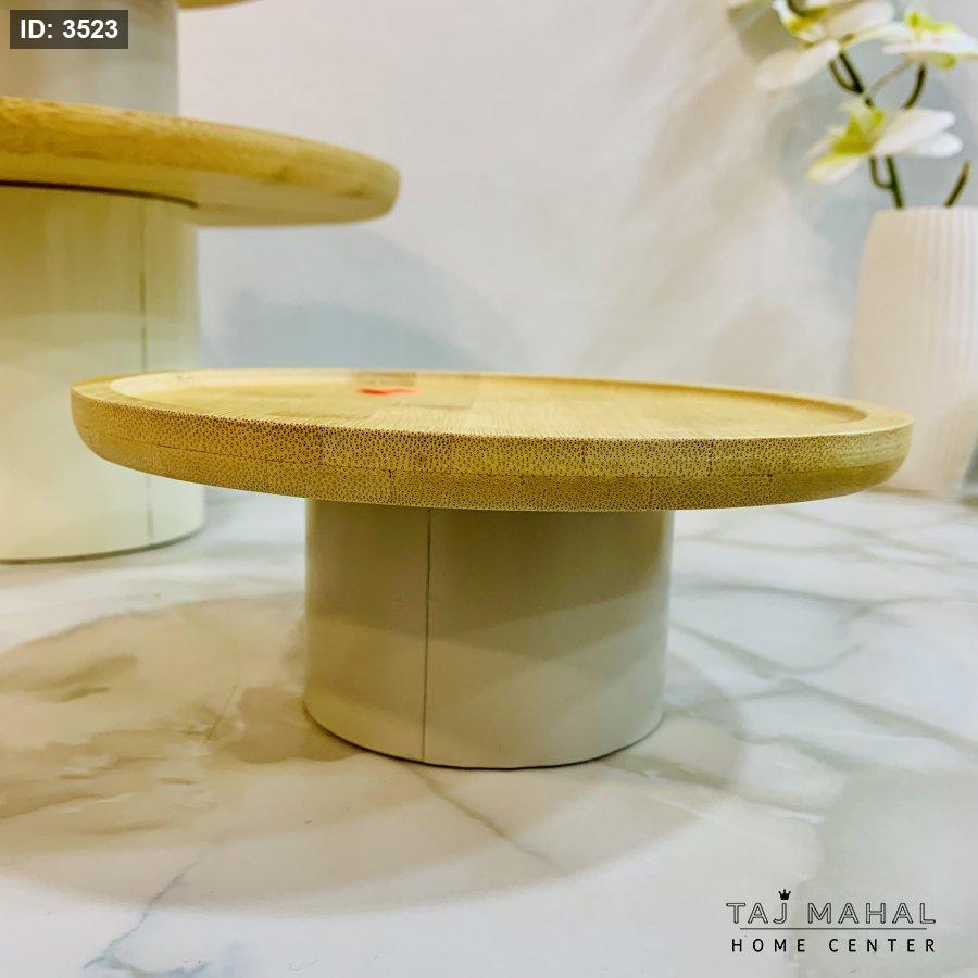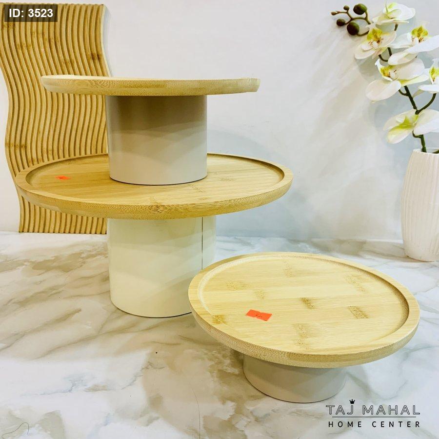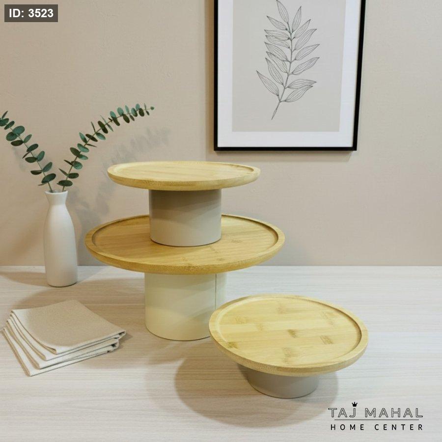 طقم ستاندات تقديم دائرية أنيقة وعصرية من خشب البامبو بقاعدة بيضاء صلبة.