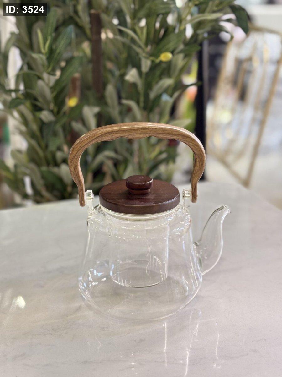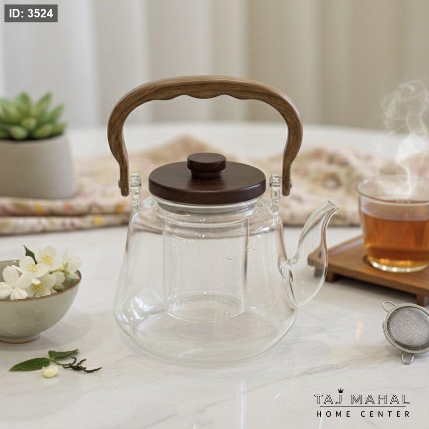 إبريق شاي زجاجي حراري مع يد وغطاء خشبي