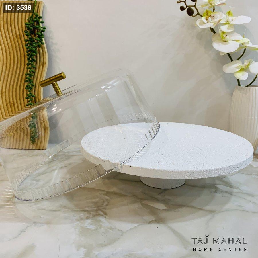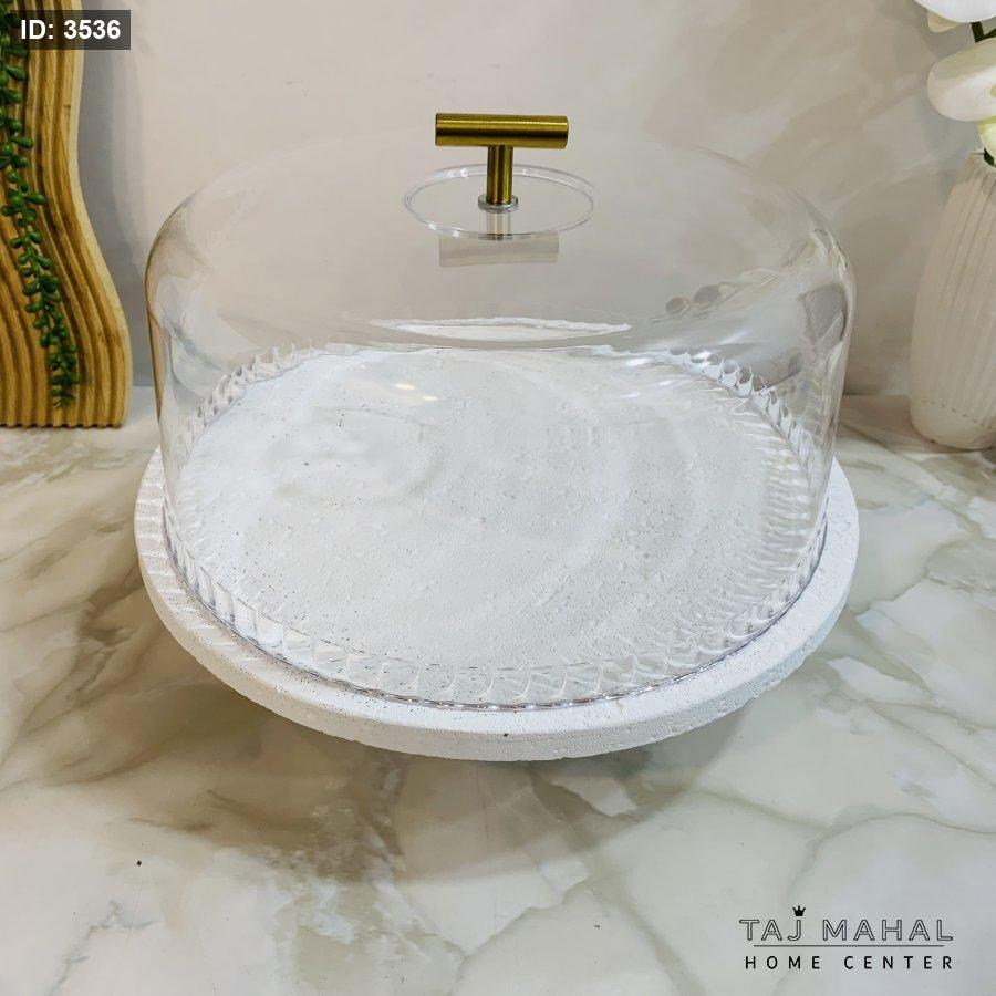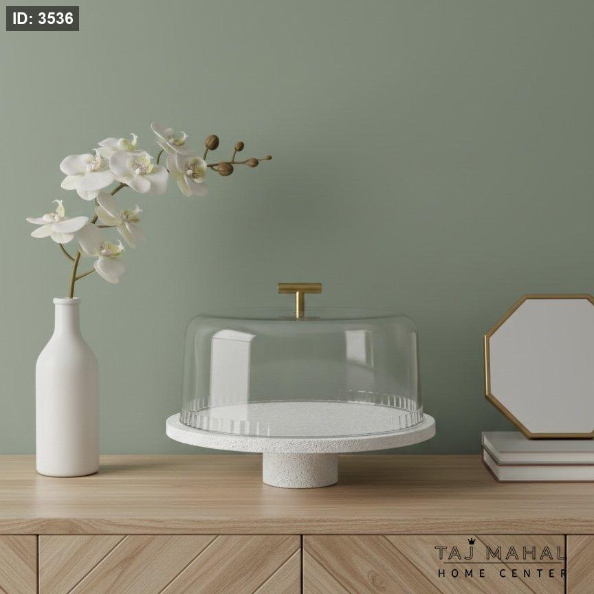 ‎طبق تقديم بقاعدة بيضاء وغطاء زجاجي شفاف ومقبض ذهبي