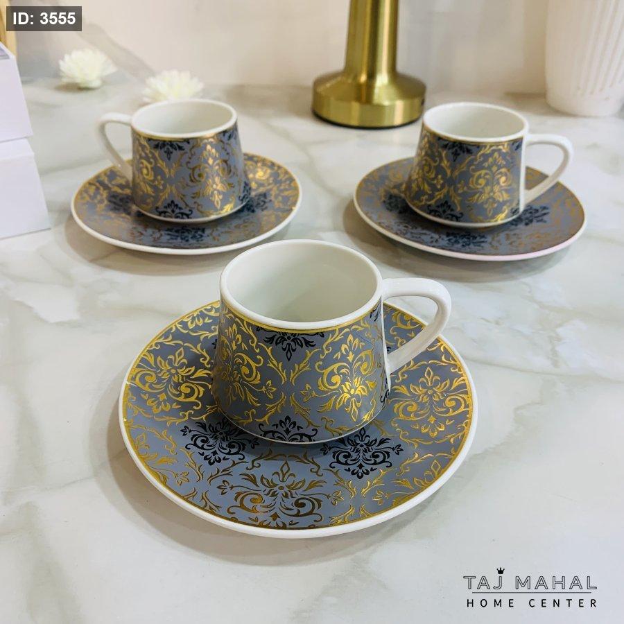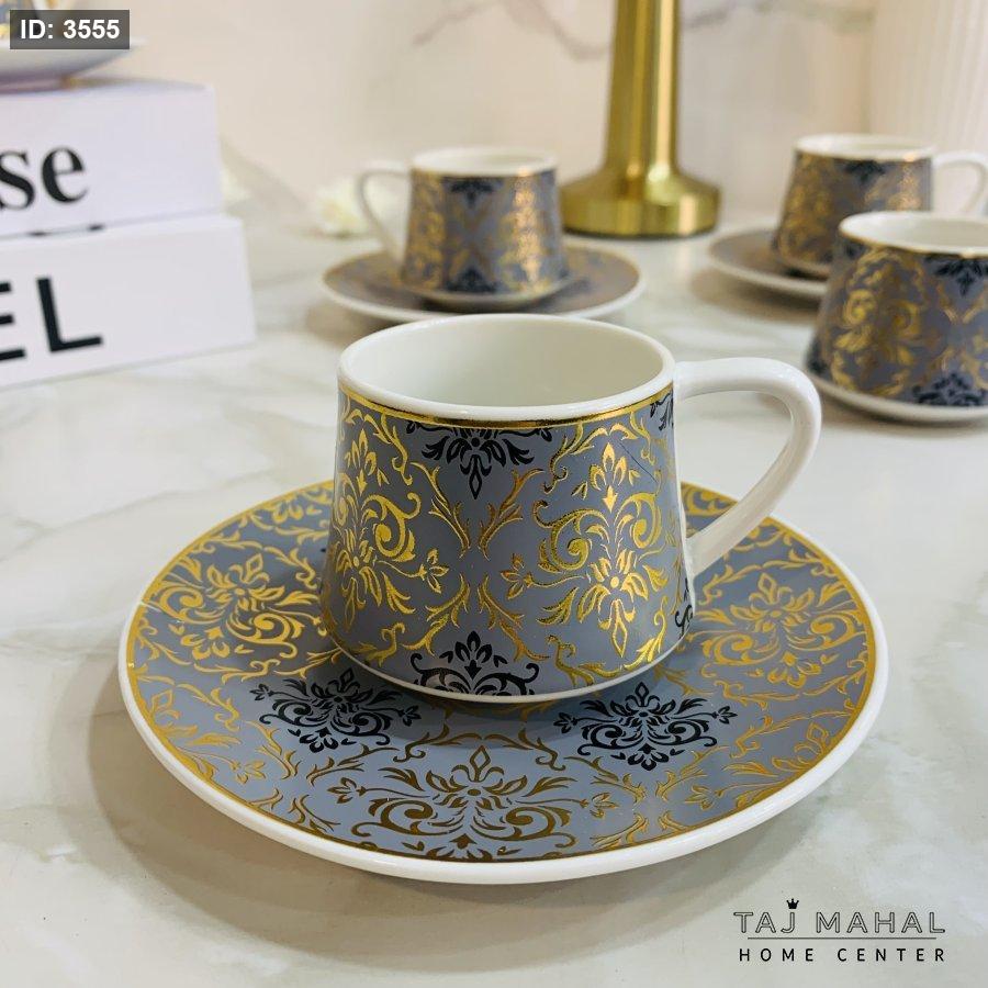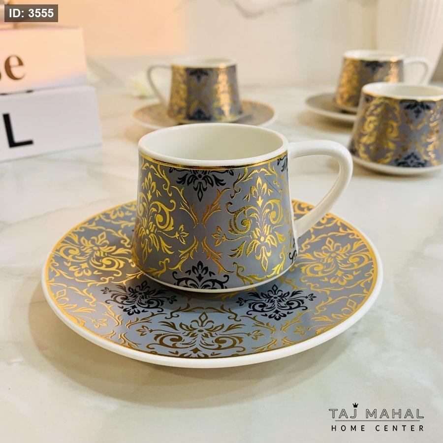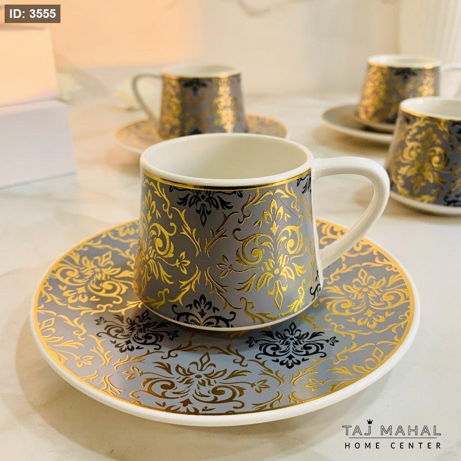 طقم 6 فناجين قهوة بورسلين بتصميم مزخرف باللونين الرمادي والذهبي