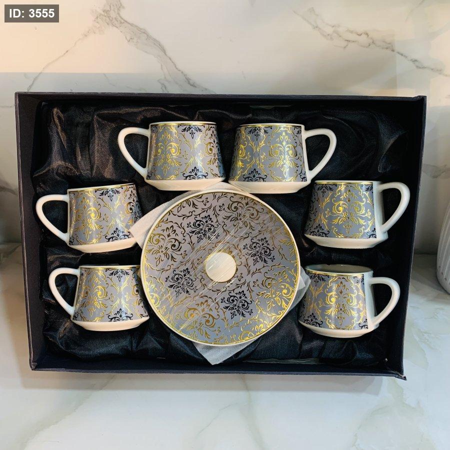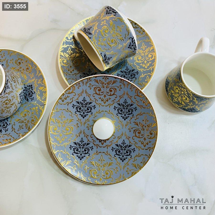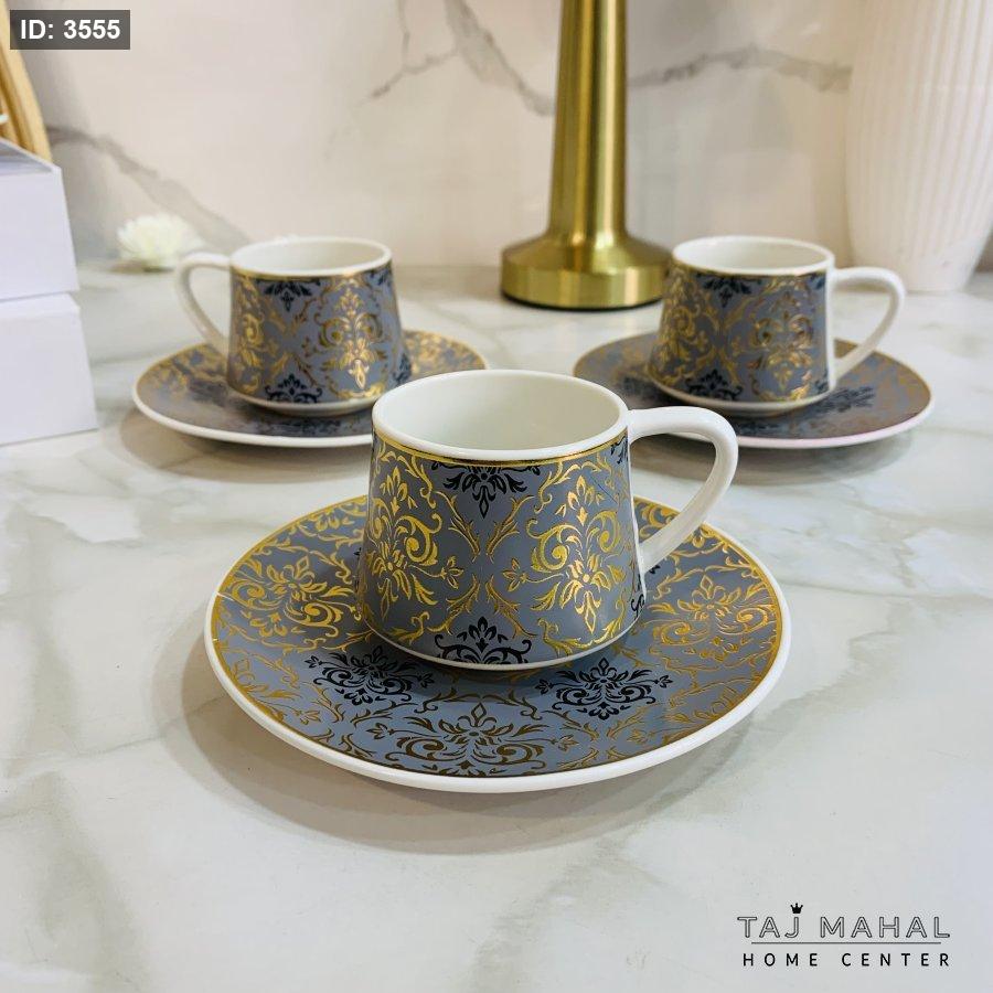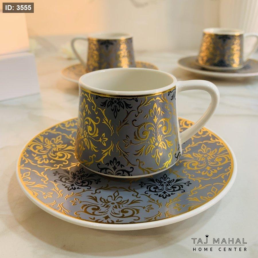 طقم 6 فناجين قهوة بورسلين بتصميم مزخرف باللونين الرمادي والذهبي