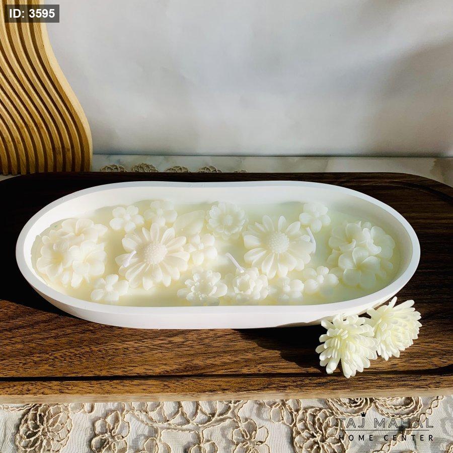 شمعة زينة بيضاء معطرة بتصميم أزهار في وعاء بيضاوي