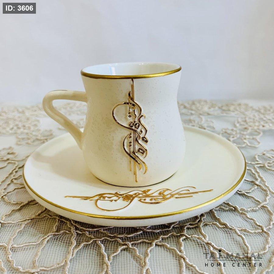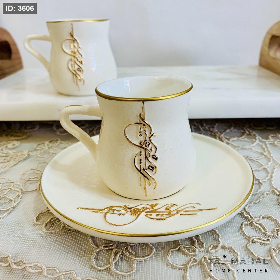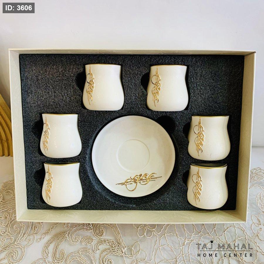 طقم ٦ فناجين قهوة بورسلان ابيض بتصميم خط عربي مزخرف