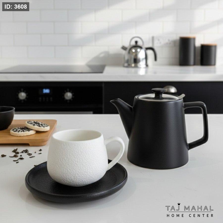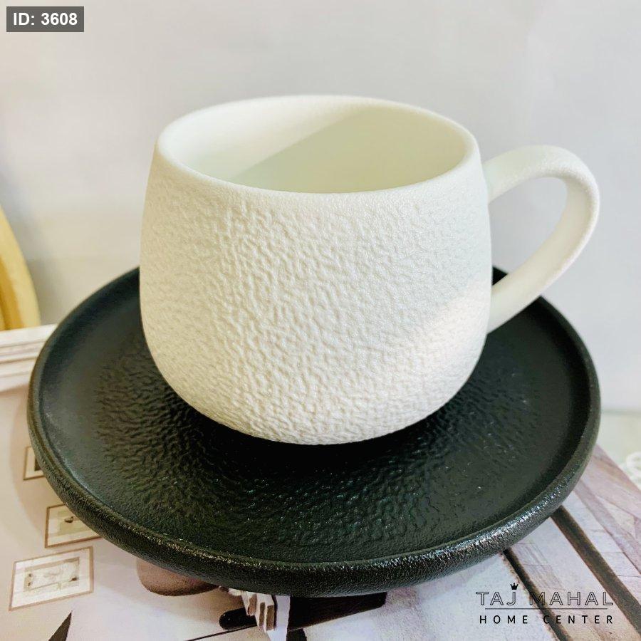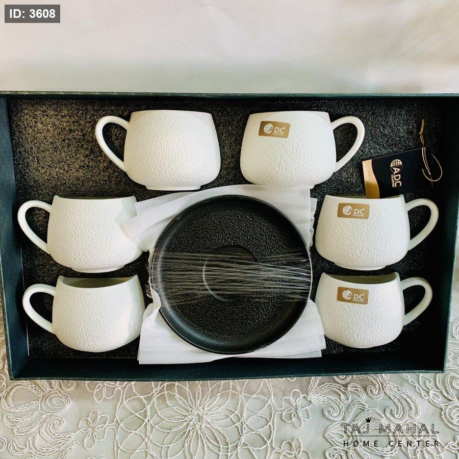 طقم ٦ كاسات شاي محجر بلون أبيض مع ٦ صحون بلون أسود