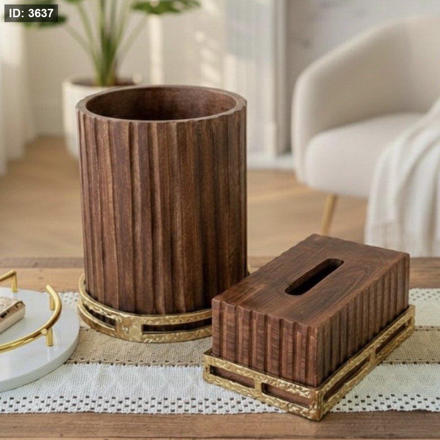طقم صالون سلة وبكيت محارم خشب مع قاعدة بإطار ذهبي