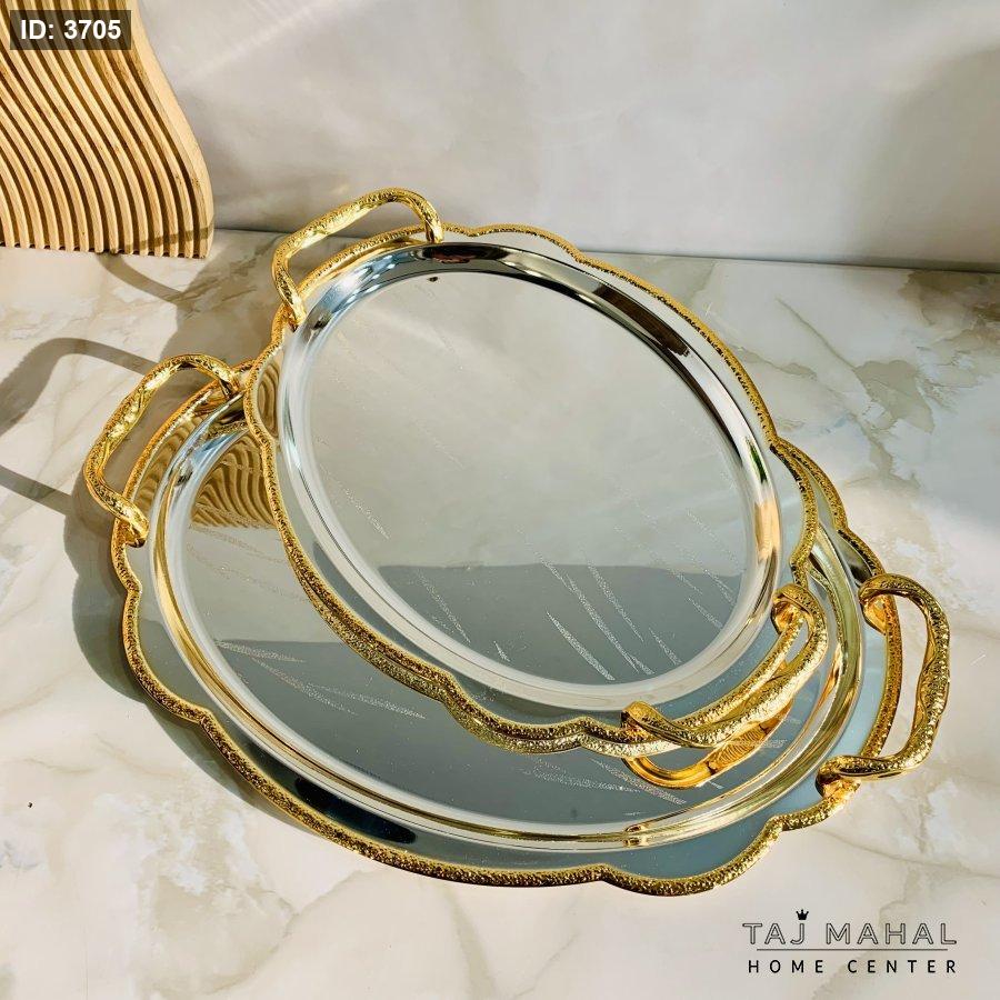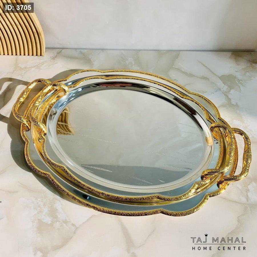 طقم صواني تقديم بيضاوية الشكل فضية مع حواف ذهبية