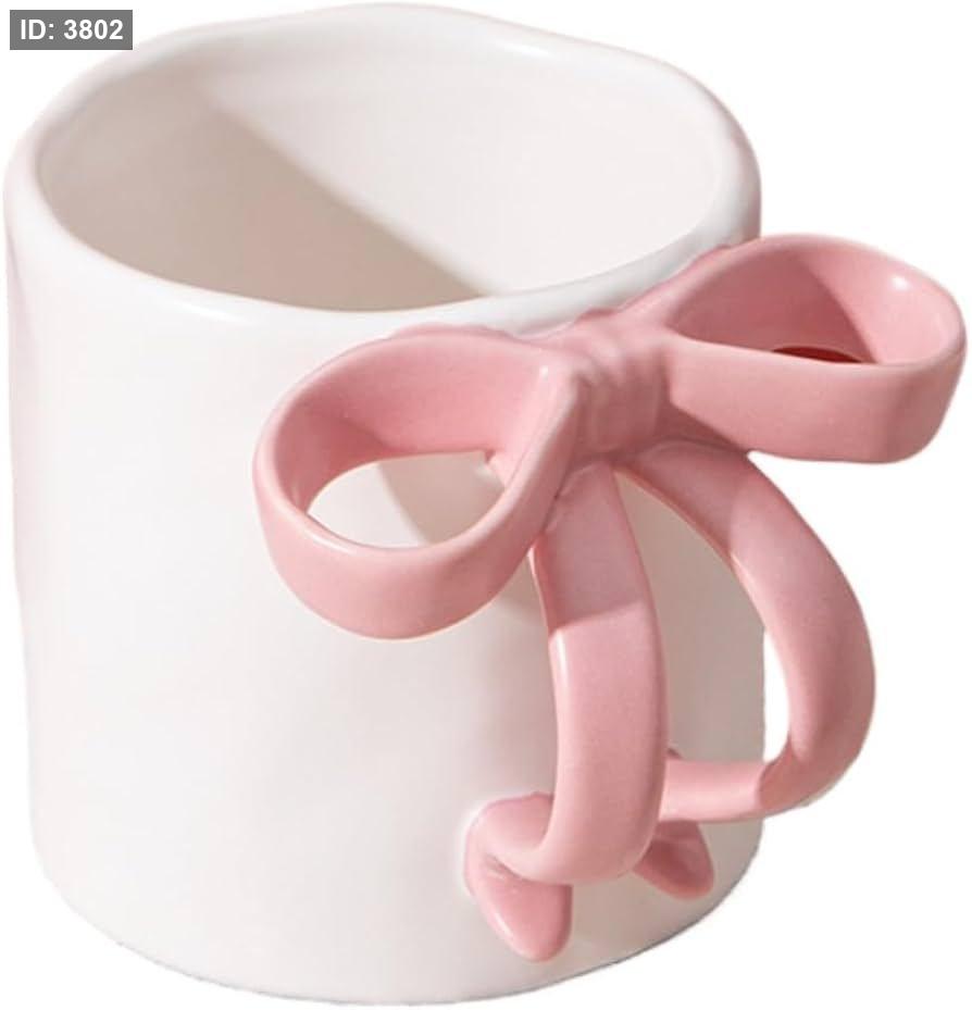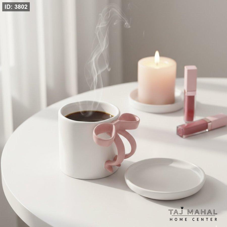 مج سيراميك أبيض مع مقبض على شكل فيونكة وردية