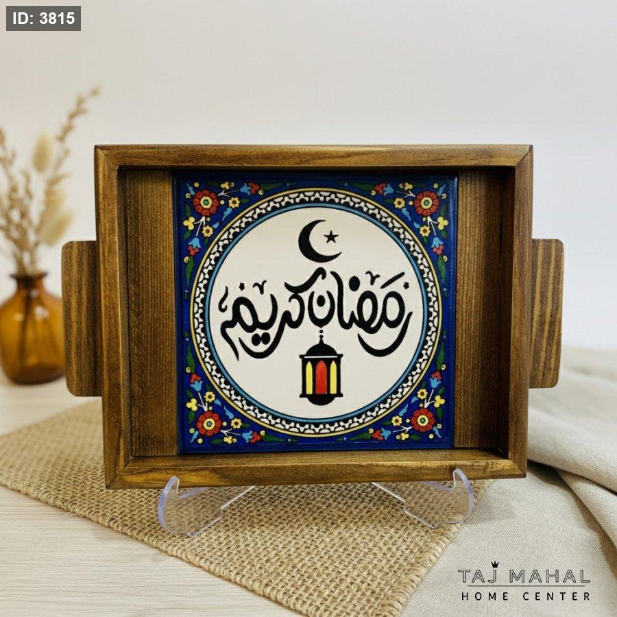 صينية تقديم خشبية مربعة ببلاطة خزف مع تصميم رمضاني