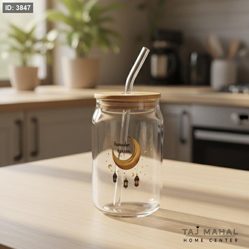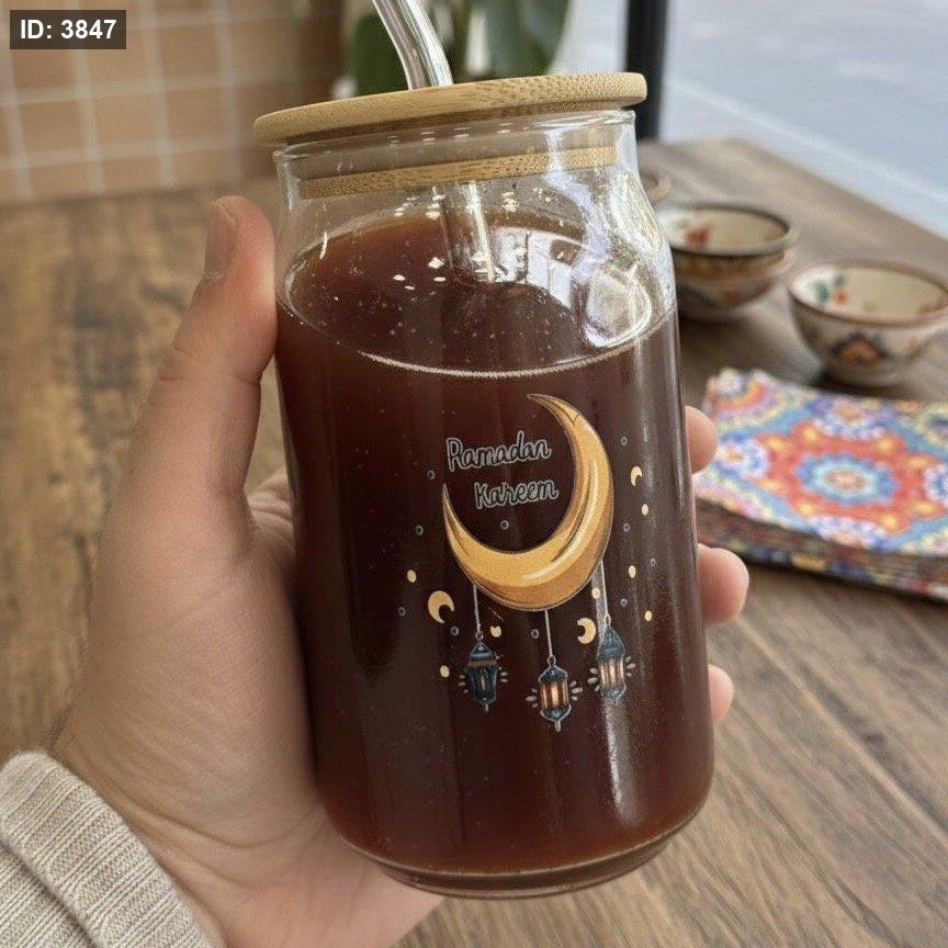 كوب زجاجي بغطاء من البامبو ومصاص زجاجي بتصميم رمضاني