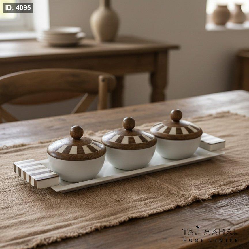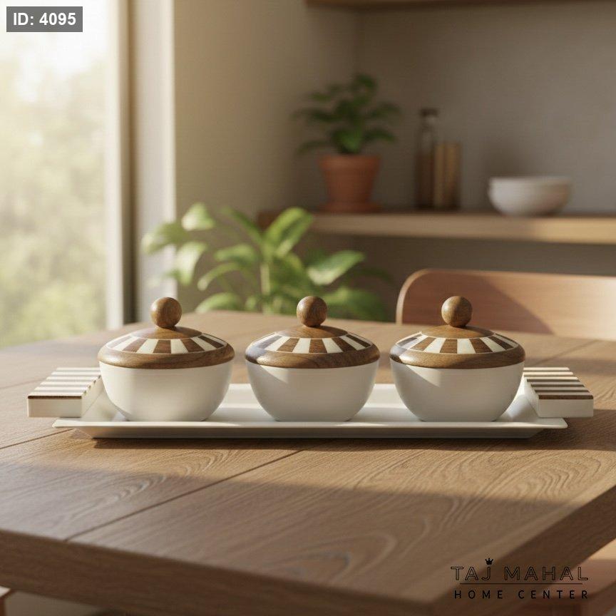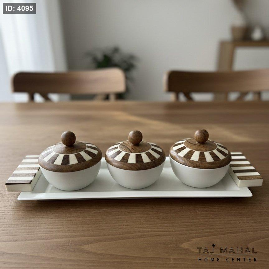 صينية تقديم مستطيلة مع 3 علب دائرية بأغطية