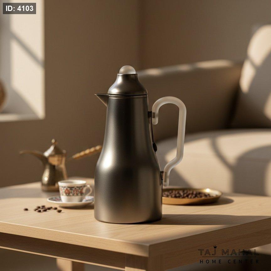 تيرموس قهوة بتصميم أنيق بلون فضي مع يد شفافة