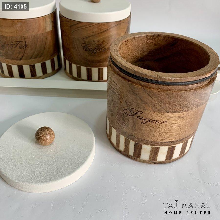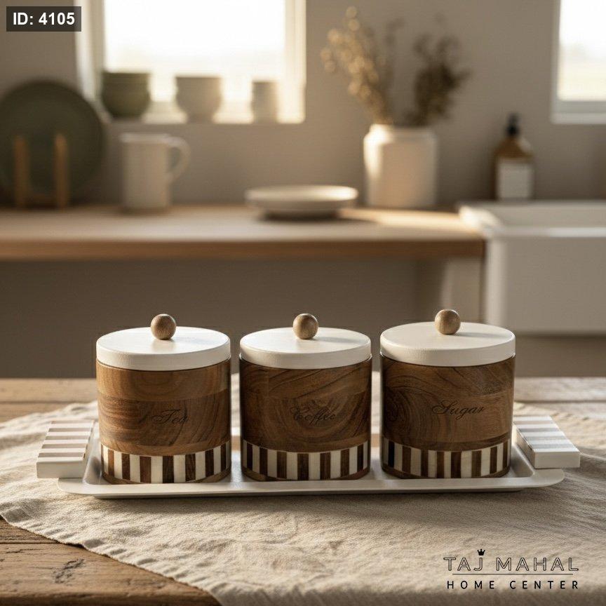 طقم 3 علب تخزين خشبية مع صينية معدنية بيضاء