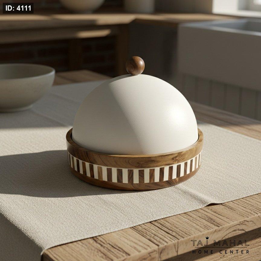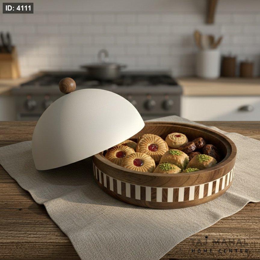 حافظة تقديم بغطاء معدني نصف كروي وقاعدة خشب هندي