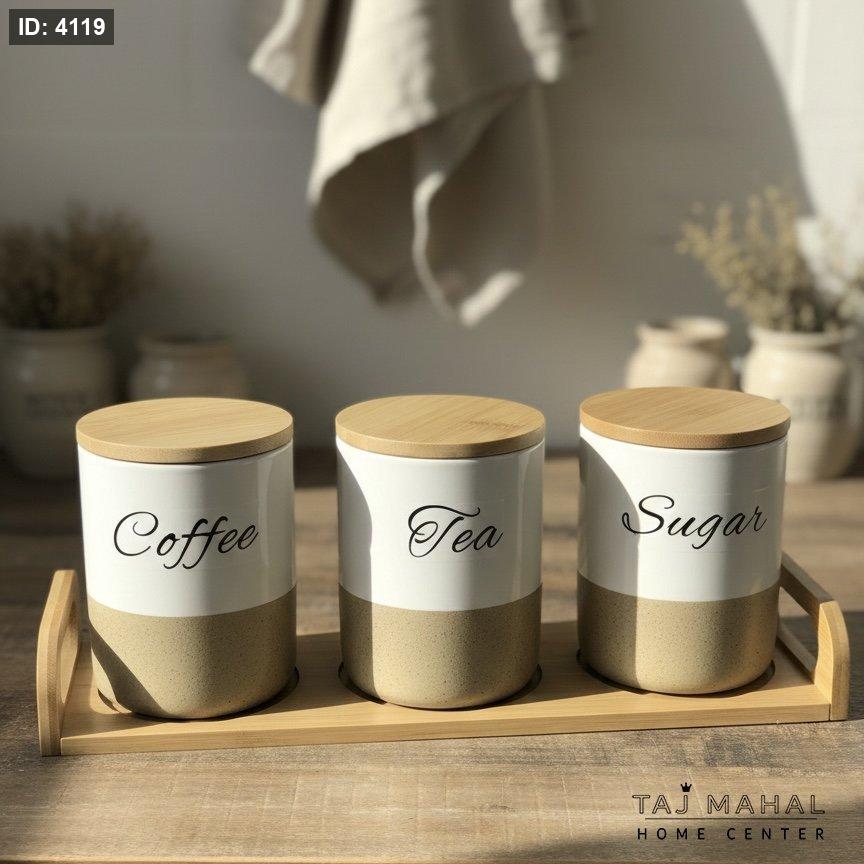طقم 3 علب سيراميك مع قاعدة من خشب البامبو