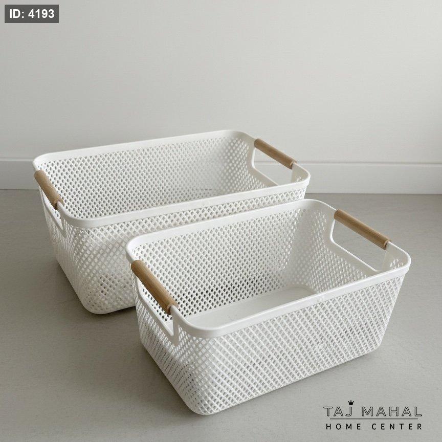 سلة تنظيم بلاستيك بيضاء بتصميم شبكي ومقابض خشبية