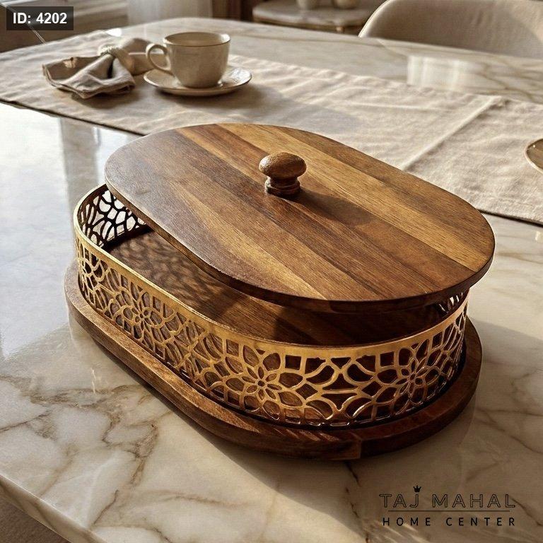 مضيفة خشب بيضاوي مع اطراف نقش CNC مع غطاء