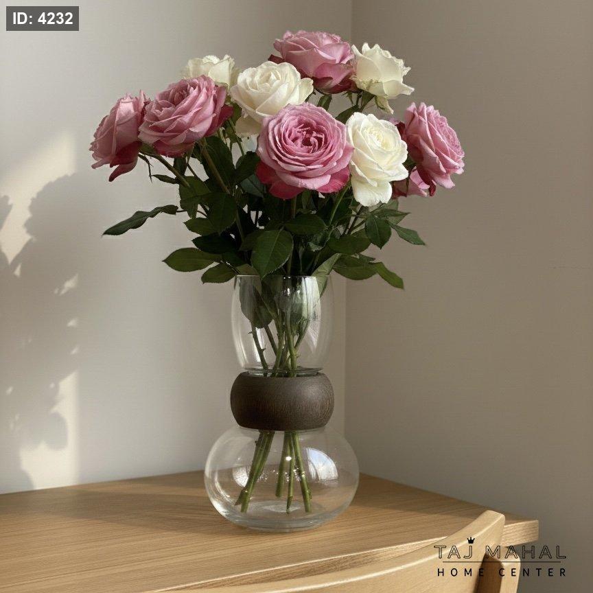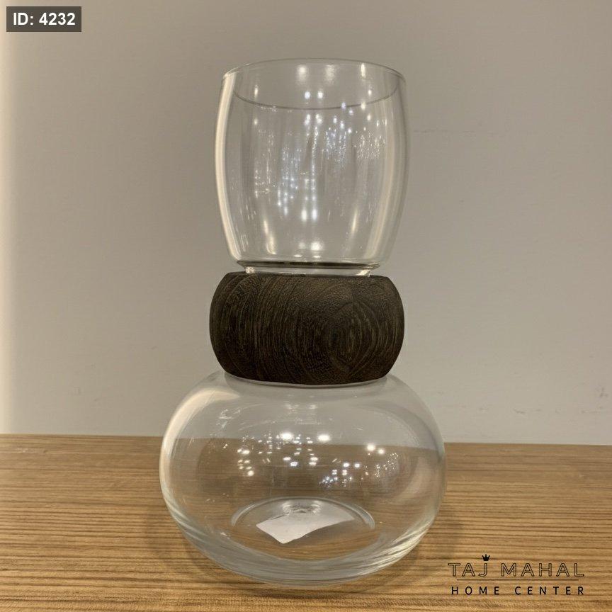 مزهرية زجاجية مع حلقة خشبية في المنتصف