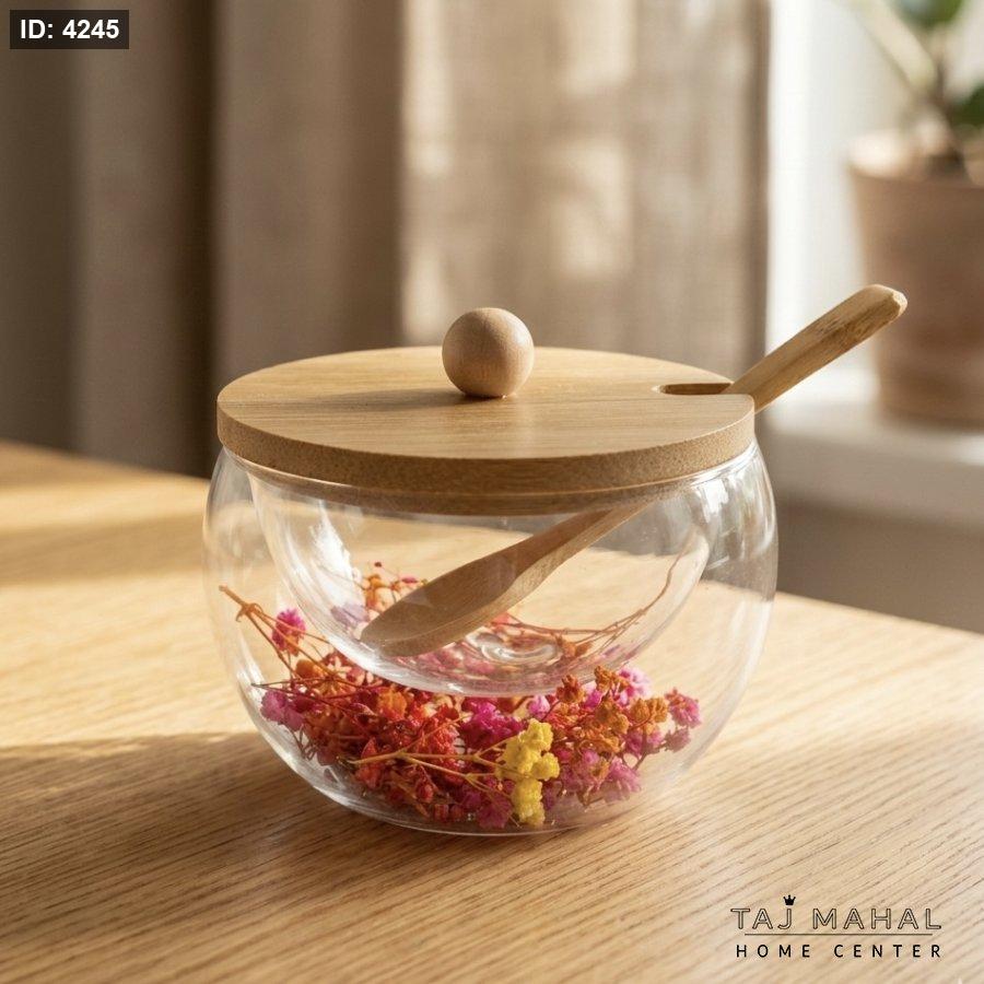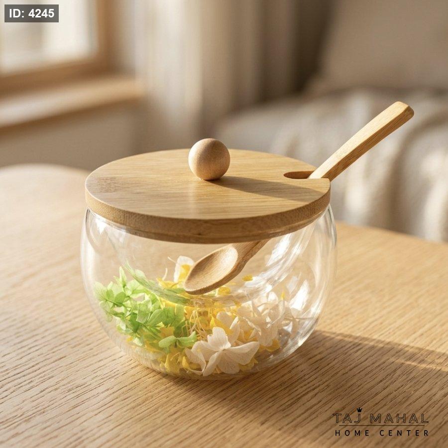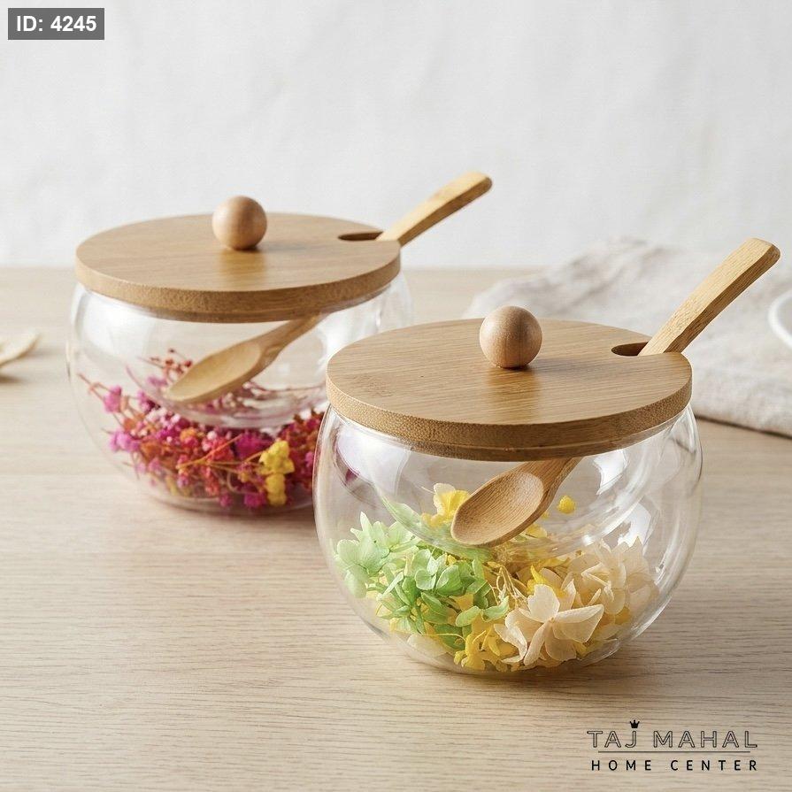 سكرية زجاجية مزدوجة الطبقات بداخلها زهور مجففة مع غطاء وملعقة خشب