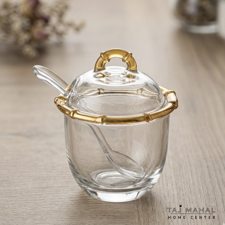 قطعة ضيافة فاخرة بتصميم عصري يجمع بين شفافية الزجاج وفخامة اللون العسلي.