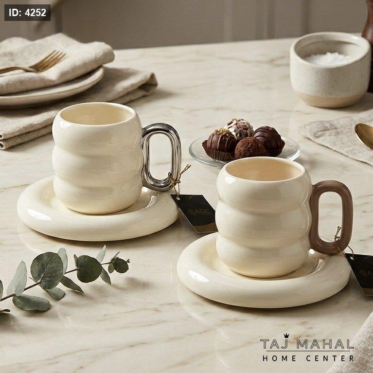 طقم كاسات مج بورسلان أبيض بتصميم حلقات مع صحن