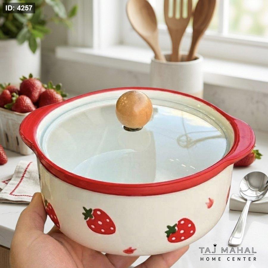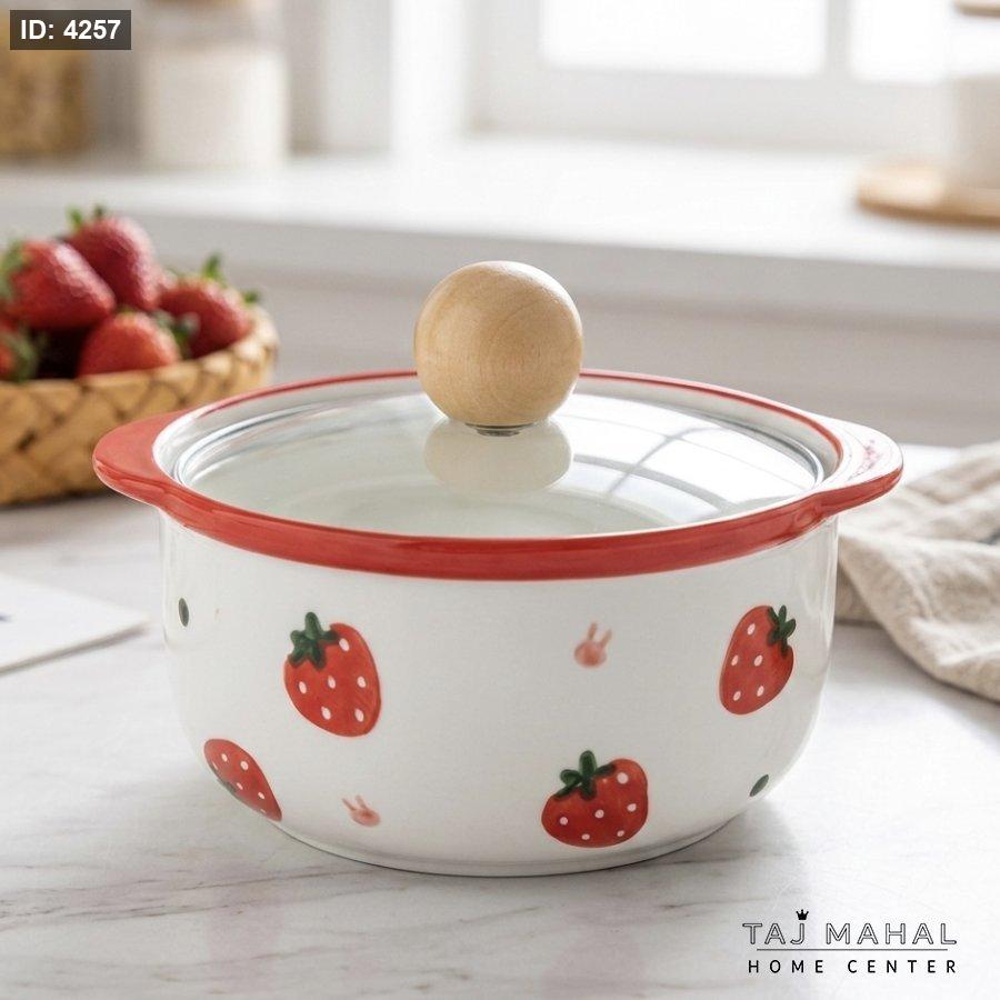 وعاء شوربة بورسلان بغطاء زجاجي حراري برسومات الفراولة