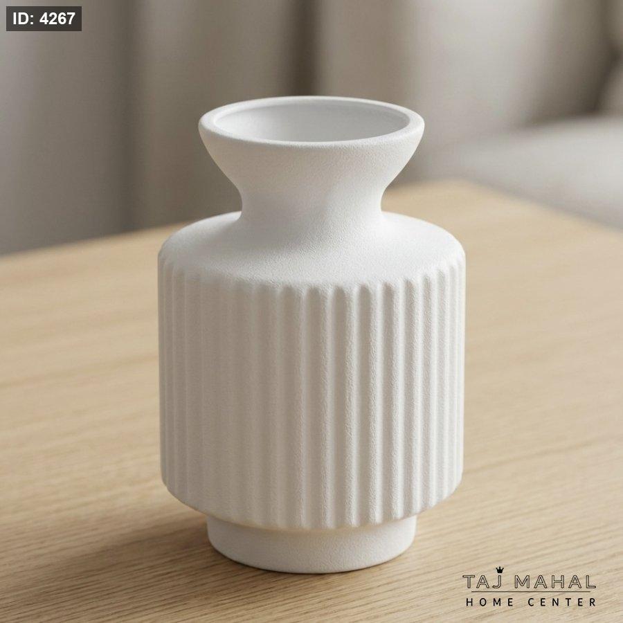 مزهرية بلاستيك ابيض أسطوانية مع خطوط طولية بارزة وعنق ضيق وقاعدة دائرية